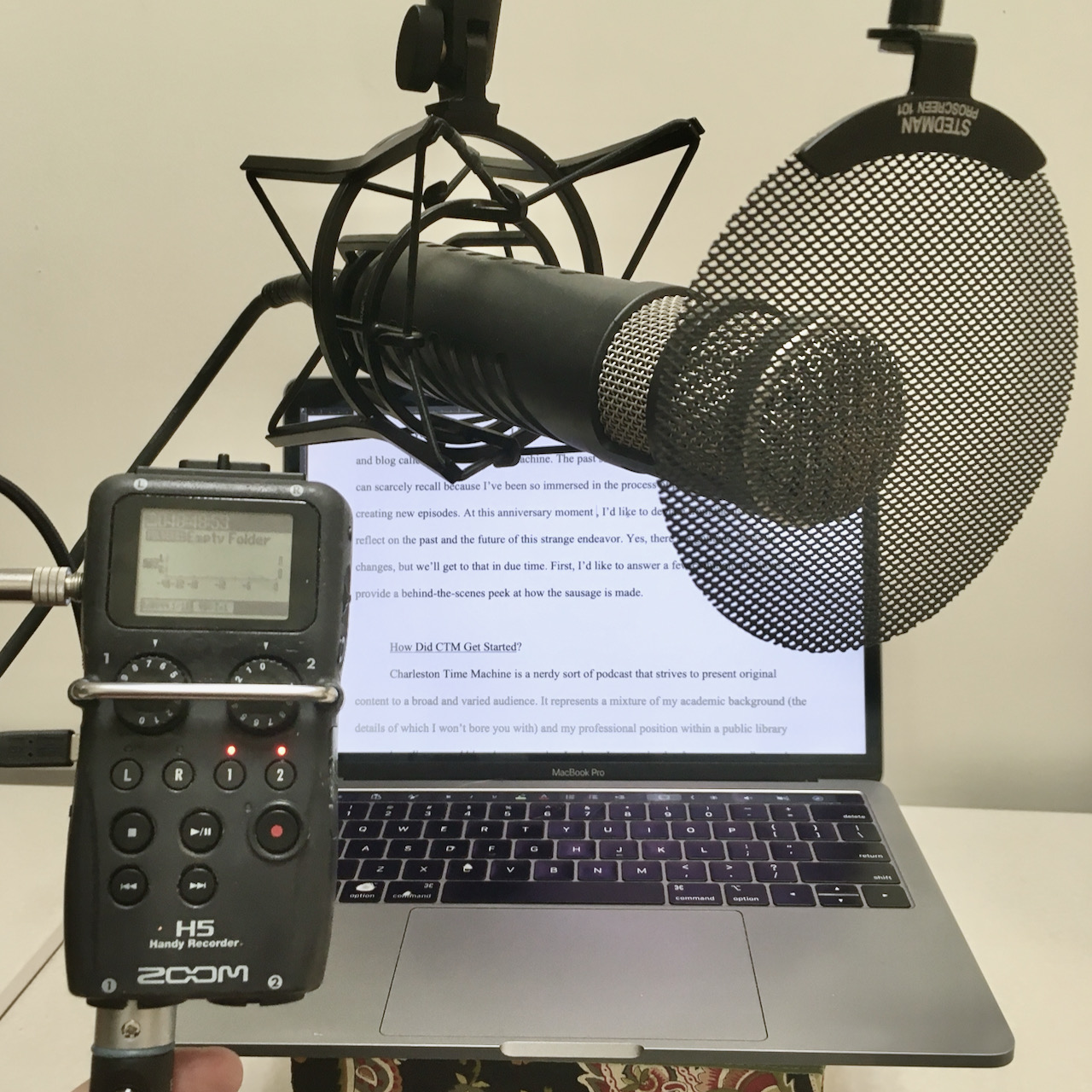 I record each episode using a Røde Podcaster microphone that is plugged directly into a small digital recording device called a Zoom H5. Armed with monitoring headphones and a pop filter to reduce plosive consonants, I simply press the record button and read the script from my laptop screen. You might have heard that many podcasters plug their microphones into their computers and record directly to the hard drive, but that approach doesn’t work for me. Because I’m reading a script from the computer, I found it cumbersome to switch back and forth between the audio and text on the same screen. Most podcasters don’t read from a script, of course, so my recording setup reflects the atypical nature of this podcast.