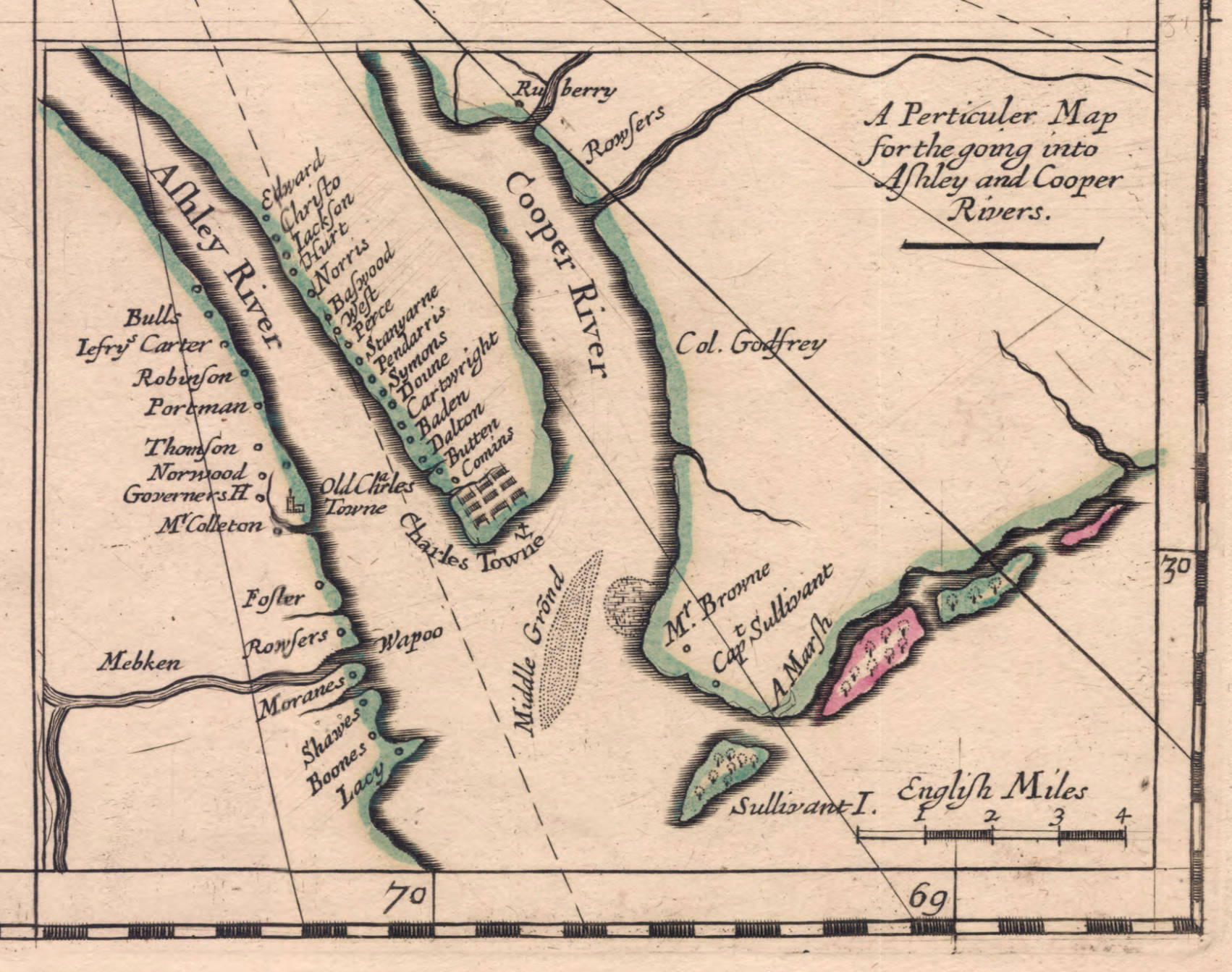 [18] Note that a contemporary copy of John Culpeper’s well-known illustration of the settlement on the Ashley River, which he sent to the Lords Proprietors in 1671, includes the name “Sullivans Island” at the mouth of Charleston Harbor (see MPI 1/13 at the National Archives, Kew). That label might have been added by Lord Ashley or another person several years later, however, as it seems unlikely that Captain O’Sullivan was stationed at that island while there was much work to be done in clearing land, planting provisions, and erecting fortifications at Albemarle Point.