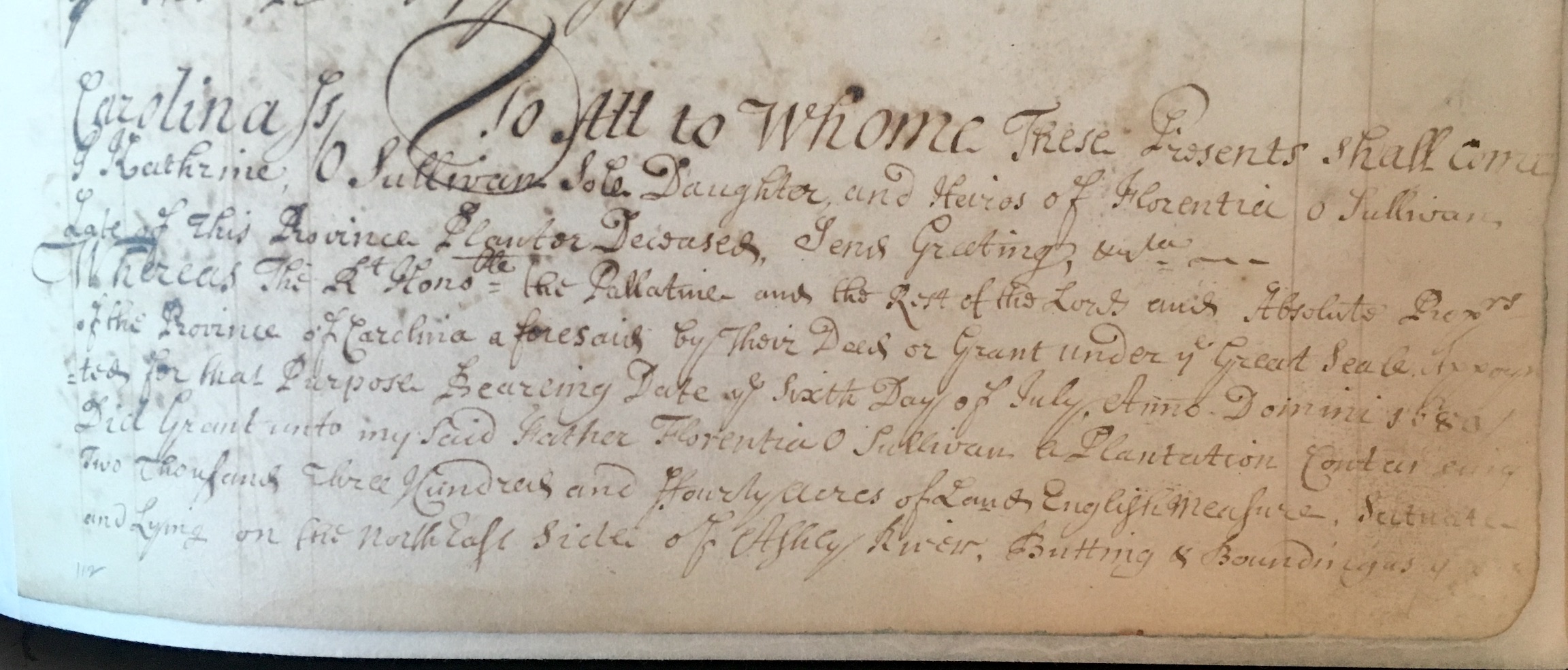 Later in the year 1692, another Carolinian of Irish extraction, Daniel Carty, bequeathed £5 sterling to “Katherine Sullivan,” whom he identified as the daughter and “orphan” of Florence O’Sullivan.[26] Katherine was still unmarried four years later, when she sold her father’s home to a neighbor. In November 1696, she conveyed to John Barksdale a tract of 330 acres bequeathed to her by her father’s will, which he had drafted on the second day of January, 1680/1. In the text of her sale to Mr. Barksdale, Katherine identified herself as the “sole daughter and heires[s] of Florentia O Sullivan,” and referenced the grant made to her father in the summer of 1680. She described the 330 acres in question as “the last and remaining part of the . . . lands above granted to my said father, and which he dyed possessed of.”[27]