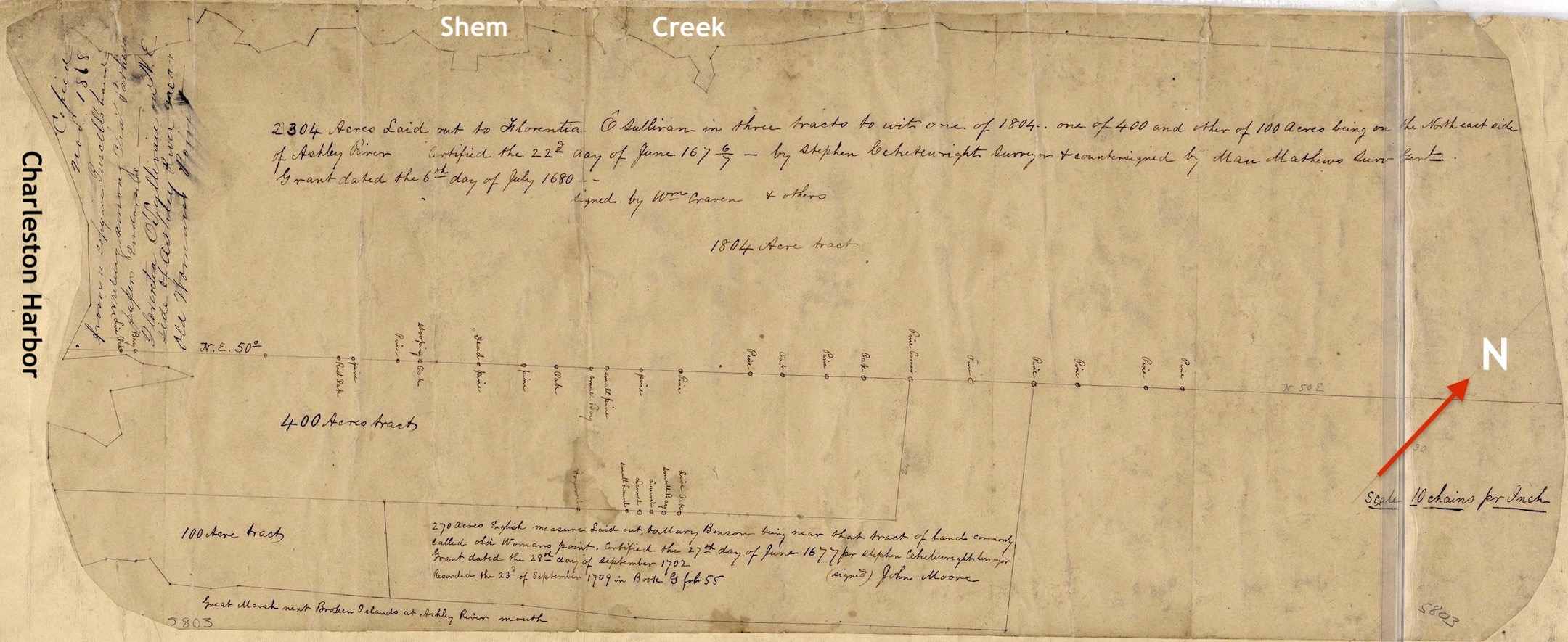 [19] McCrady Plat No. 5803, held by the Charleston County Register of Deeds Office, is an 1868 copy of an earlier plat by Joseph Purcell (died 1807), who made a copy of Stephen Wheelwright’s original plat. Text on the 1868 copy states that Wheelwright’s plat was “certified the 22d day of June 1676/7” (probably representing a mis-transcription of the Julian Calendar date 22 January 1676/7). Note that the three parcels depicted on this plat (measuring 1,804; 400; and 100 acres respectively) form a total of 2,304 acres, which differs from the text of the 1680 grant to O’Sullivan that specified 2,340 acres. Because the latter figure is repeated in multiple contemporary sources, the figure 1,804 in the 1868 copy probably should be 1,840.