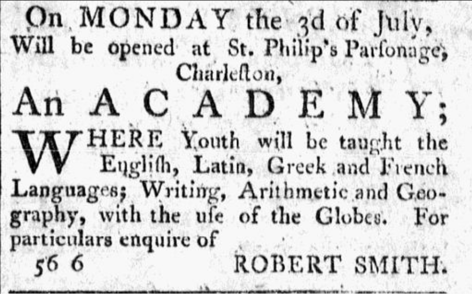 [17] Smith first advertised his academy in the [Charleston] Columbian Herald, 20 June 1785. See also J. H. Easterby, History of the College of Charleston, Founded in 1770 (Charleston, S.C.: College of Charleston, 1935), 20–41. A succinct biography of Robert Smith is found in Walter Edgar and N. Louise Bailey, eds., Biographical Directory of the South Carolina House of Representatives, volume 3 (Columbia: University of South Carolina Press, 1981), 671–73.