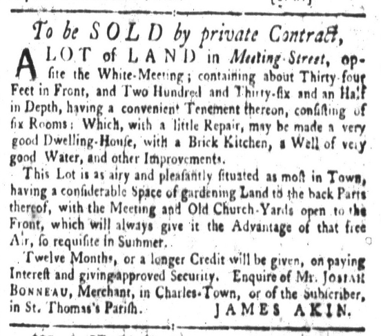 A lot of land in Meeting-Street, opposite the White Meeting; containing about thirty-four feet in front, and two hundred and thirty-six and an half in depth, having a convenient tenement thereon, consisting of six rooms: Which, with a little repair, may be made a very good dwelling-house, with a brick kitchen, a well of very good water, and other improvements. This lot is as airy and pleasantly situated as most in town, having a considerable space of gardening land to the back parts thereof, with the Meeting and Old Church-Yards open to the front, which will always give it the advantage of that free air, so requisite in summer.[12]