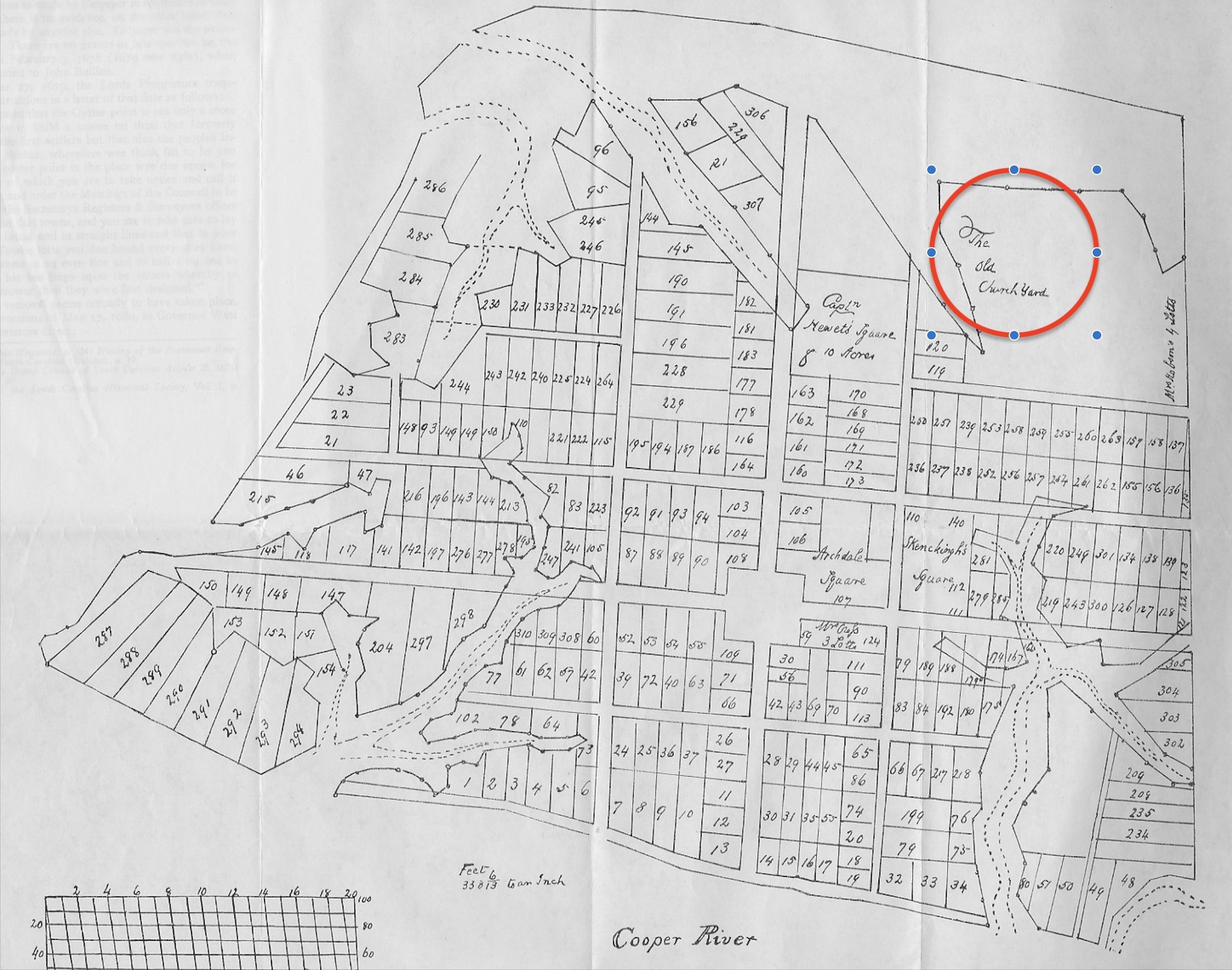 In the original town plan of present-day Charleston, the so-called “Grand Model” drafted in 1672 before the town between the Ashley and Cooper Rivers had a name, all of the land to the south of what became Beaufain Street (and its eastward continuation) was divided into approximately 300 half-acre lots and a dozen streets. This plan also included a large, vaguely defined parcel of land at the northwest corner of the town that was set aside for general or “common” use, and which the town’s early inhabitants apparently used as a public burial ground. Surviving copies of the Grand Model include a label describing this parcel as “The Old Church Yard,” although there was never a church at or near that site.[3]