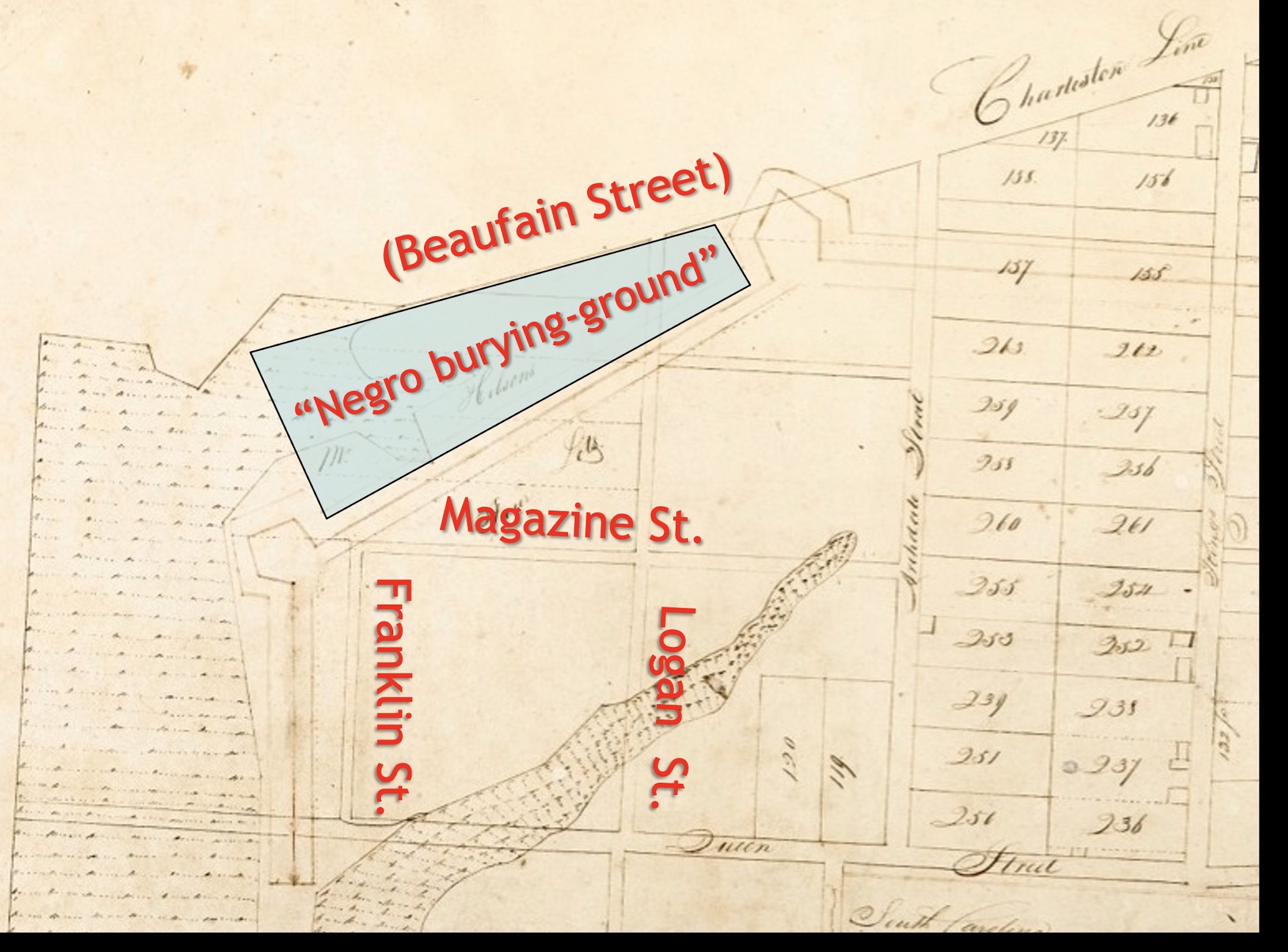 The government of South Carolina addressed these concerns tangentially in a law ratified in the summer of 1746. During a period of war with both France and Spain, the provincial legislature had just finished the construction of a new line of earthen fortifications, fronted by a broad moat or “ditch,” to protect the north and west sides of urban Charleston. These new entrenchments cut through and occupied part of the land immediately north and west of the public burying ground, which belonged to private parties. To protect the fortifications and to compensate the private owners for their loss of land, the provincial government exercised its power of eminent domain and expropriated a parcel of land immediately northwest of the “Old Burying Ground.” More specifically, the government absorbed “two acres, one rood and one perch of land [2.26 acres], lying to the north west of the ditch, between the two westernmost bastions and the town line,” which was “allotted for a negro burying-ground for ever.” Furthermore, the government ordered that “a convenient passage to the said negro burying-ground shall be laid out through the glebe land.” That passageway later became the eastern part of Beaufain Street.[10]