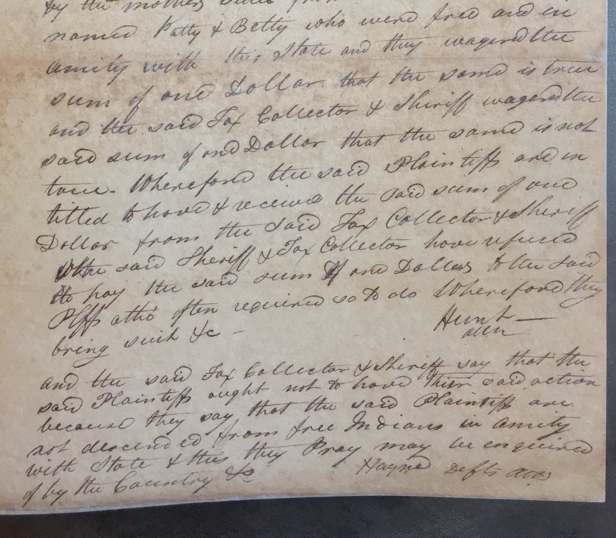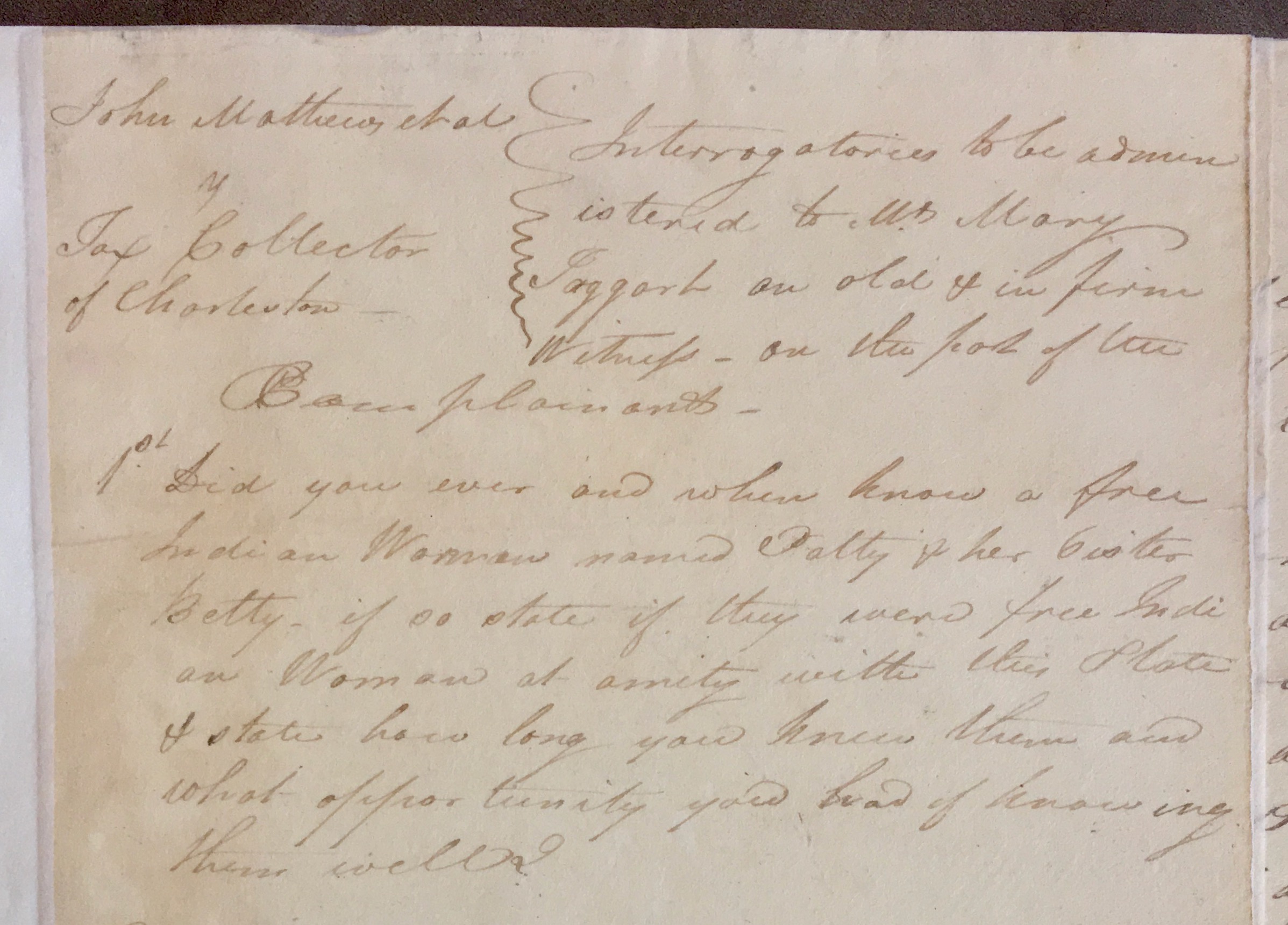 On 10 May 1819, Hunt and his clients, John Mathews, Isaac Mathews, Henry Mathews, Peter Mathews, Hannah Brown, Betsy Mushington, and Nancy Brown, appeared in court in Charleston to protest being assessed for the state capitation tax due in 1818. The plaintiffs argued that they were not liable for this tax because they were the children and grandchildren of “two free Indian women in amity with this state before the Revolution, to wit Patty and Betty for a long time residents in and inhabitants of this state and by its laws and usages entitled to all the rights privileges and immunities of free persons & citizens.” Patty “had issue a daughter named Mary, who intermarried with one [Peter] Mathews and had issue John, Isaac, Henry, and Peter.” Betty “had issue a daughter named Nancy, who intermarried [with Moses Brown] & had issue the actors Hannah and Betsy.” In spite of sworn testimony supporting their claim, the plaintiffs stated, tax collector Samuel Burger had reported the plaintiffs as tax defaulters to the sheriff, who had lodged executions against their goods and chattel in lieu of payment. The plaintiffs sought to be relieved of the tax burden and asked the court to issue a “Writ of Prohibition directed to the said tax collector and sheriff to prohibit them from levying and collecting the said tax or proceed further touching the premises.”[22]