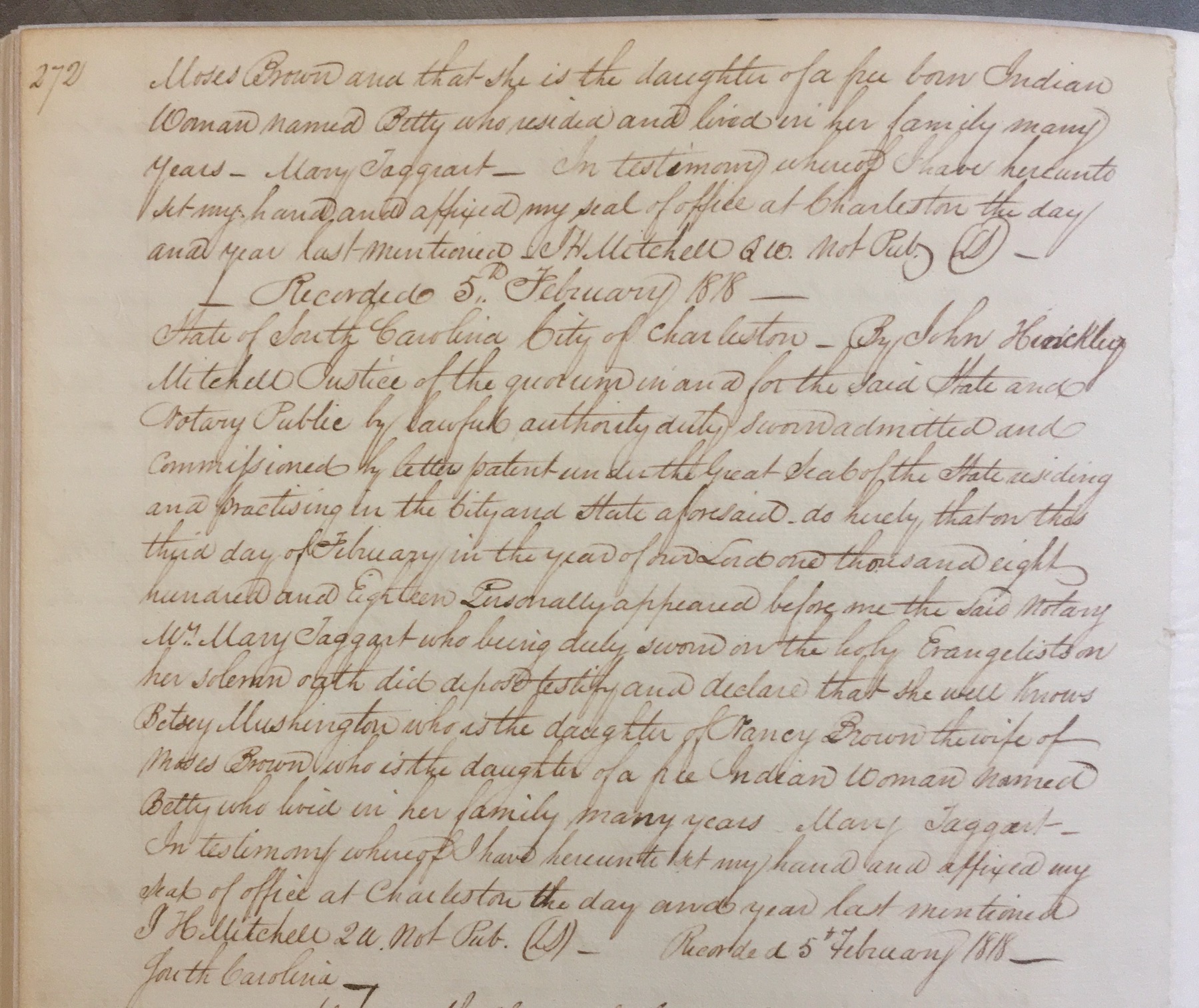 On 3 February 1818, Mary Taggart voluntarily appeared before a local justice of the peace, John Hinckley Mitchell, to record a series of brief affidavits, several of which survive among the manuscripts held at the South Carolina Department of Archives and History in Columbia. Mitchell wrote that “Mary Taggart who being duly sworn, on the holy Evangelists on her solemn oath did depose testify and declare that she well knows Nancy Brown the wife of a free man of color named Moses Brown and that she is the daughter of a free born Indian woman named Betty who resided and lived in her family for many years.” In a separate but nearly identical statement, Mary swore “that she well knows Betsey Mushington who is the daughter of Nancy Brown the wife of Moses Brown who is the daughter of a free Indian woman named Betty who lived in her family [for] many years.” Similar affidavits for Hannah Brown and the Mathews brothers must have followed, but have not been located. The Mathews brothers, in short, claimed descent from a free Indian woman named Patty, whose origins are now obscure.[19]