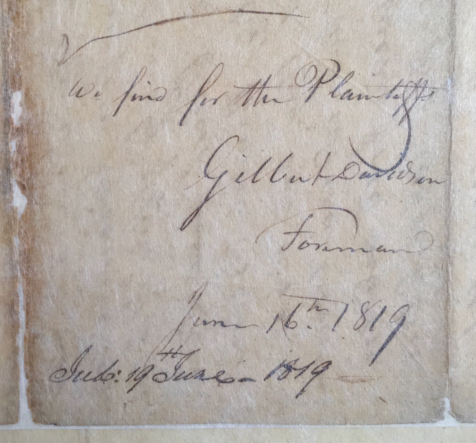 The collected material relevant to the case of “John Mathews et al. vs. Tax Collector of Charleston” was presented a jury of White men in mid-June 1819. Representing the defendant was South Carolina Attorney General Robert Young Hayne, who argued simply that the plaintiffs were not the descendants of free Indians. While both sides agreed that John Mathews and Samuel Burger had “wagered the sum of one dollar that the same is true and the said tax collector & sheriff wagered the said sum of one dollar that the same is not true,” the plaintiff’s attorney, Hunt, argued that the plaintiffs had proved their lineage and were “entitled to the sum of one dollar from the defendants who refuse payment.” After reviewing the sworn affidavit of Mary Taggart, the matter was submitted to the jury. On June 16th, foreman Gilbert Davidson reported their verdict: “We find for the Plaintiffs.” The court recorded the judgment several days later, and the matter concluded.[23]