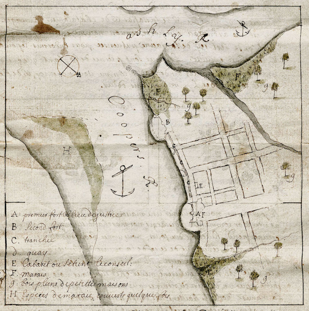 The population of new Charles Town and its maritime traffic expanded rapidly after the capital moved to the peninsula in 1680. Shipping was the lifeblood of the nascent colony, connecting South Carolina to distant ports in England and the Caribbean. Descriptions of life within the new capital of South Carolina from the 1680s are now exceedingly scarce, however, rendering it difficult for modern Charlestonians to imagine the initial condition of the town’s eastern waterfront along the Cooper River. Fortunately, the recently discovered, hand-drawn map of Charleston, ostensibly made in the spring of 1686 by French immigrant Jean Boyd, provides a valuable visual depiction of the small town that was mostly clustered near the Cooper River and south of Broad Street (see Episode No. 98).