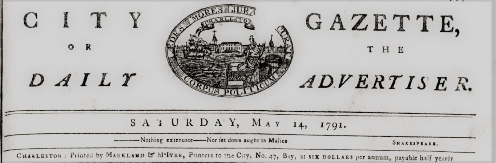 “This morning, at six o’clock, the President of the United States set out from this city, for Savannah, in Georgia. He was escorted to Ashley ferry by his excellency the governor, honorable Mr. Izard, honorable Major Butler, members of the Cincinnati, and officers of the militia, all mounted on horseback. At Boundary street [, now Calhoun Street,] they were met by the intendant and wardens of the city, where the president was addressed by his honor the intendant as follows:”
