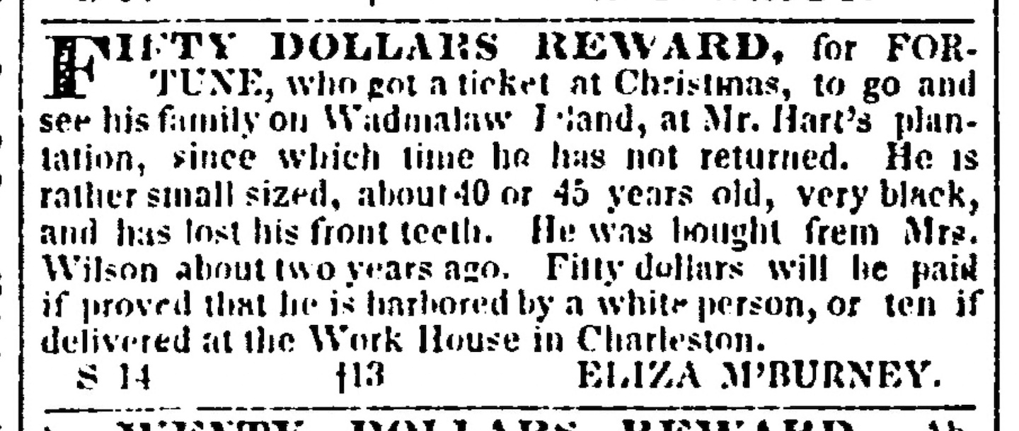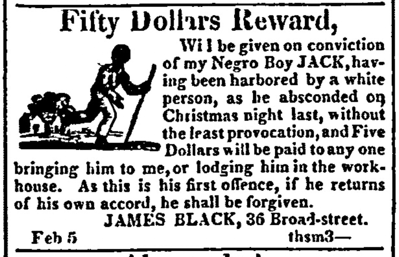 The temporary relaxation of normal rules at Christmas provided some enslaved people across the South with the opportunity to flee. Browsing through the newspapers of eighteenth and nineteenth century South Carolina, I’ve seen dozens of notices offering rewards for the capture of enslaved men and women who ran away from their owners during the Christmas holiday. Rarely do we know the specific motivations that inspired these flights or the objectives they sought to achieve. Perhaps someone was denied permission to visit a loved one on a nearby plantation and they were determined to make the temporary journey one way or another. Perhaps a spouse had been sold and carried away, leading a husband or wife to seek a permanent reunion during the customary holiday recess. Perhaps, like a young man named John Andrew Jackson, they were simply determined to escape the pain and injustice of slavery and find freedom elsewhere.
