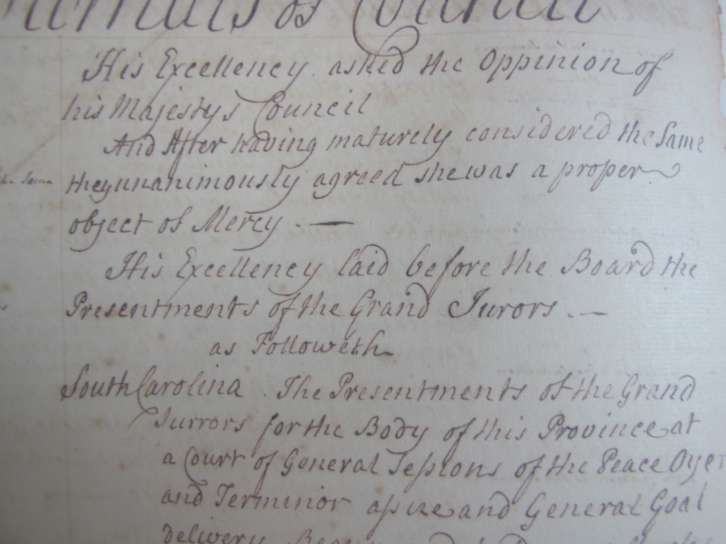 [1] John Derry (aka Dearry), for example, was tried, convicted, and sentenced to death at the October sessions of 1753, but the jurors asked the court (i.e., the judges) to recommend Derry to the governor “as an object of his favour [sic] and clemency.” See South Carolina Department of Archives and History, Records of the General Assembly, Journal of His Majesty’s Council, No. 23 (1754), pages 29 (2 January 1754).