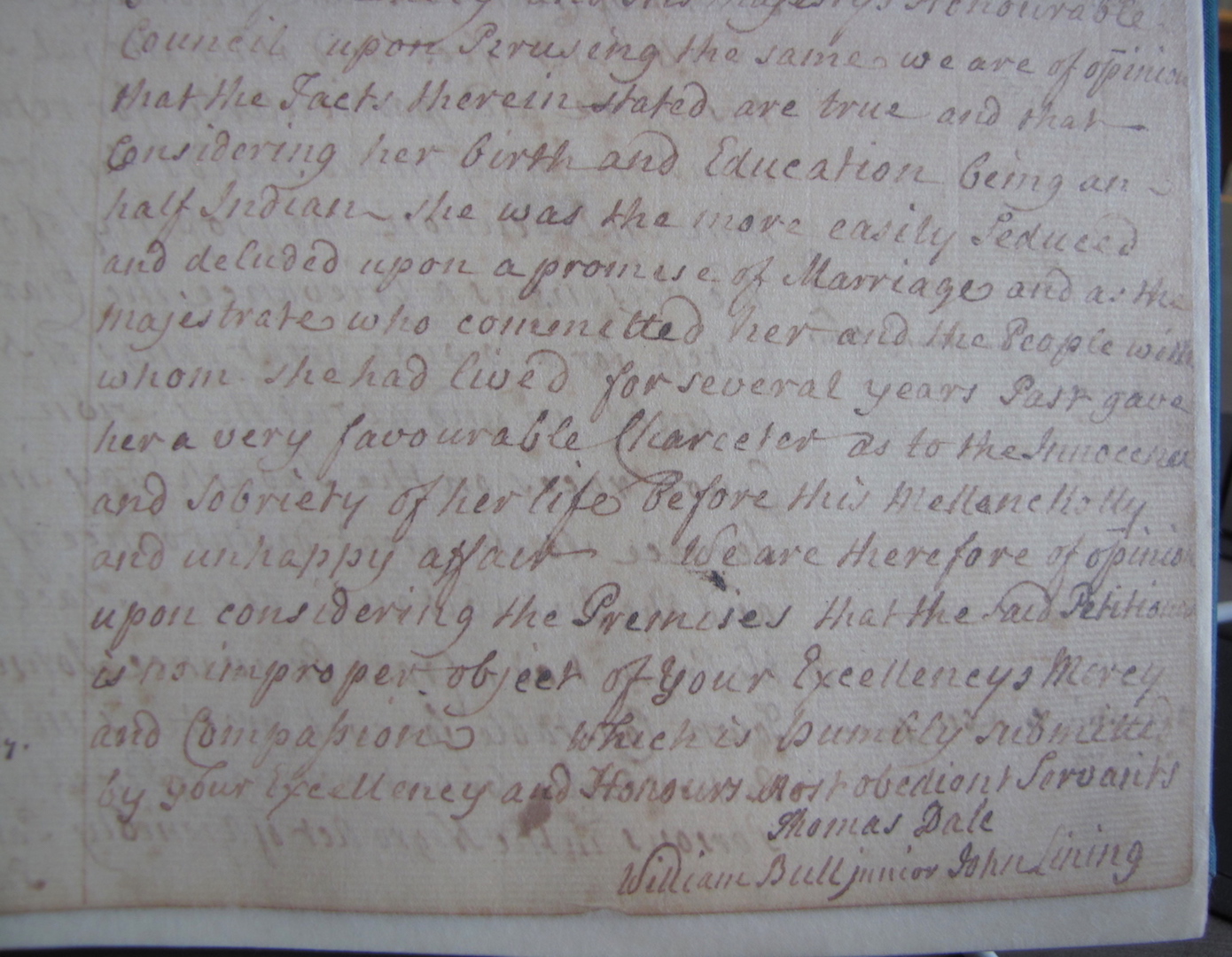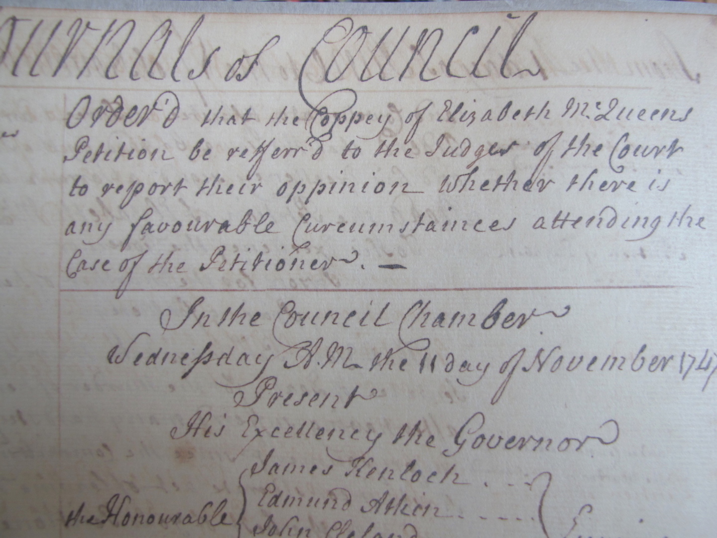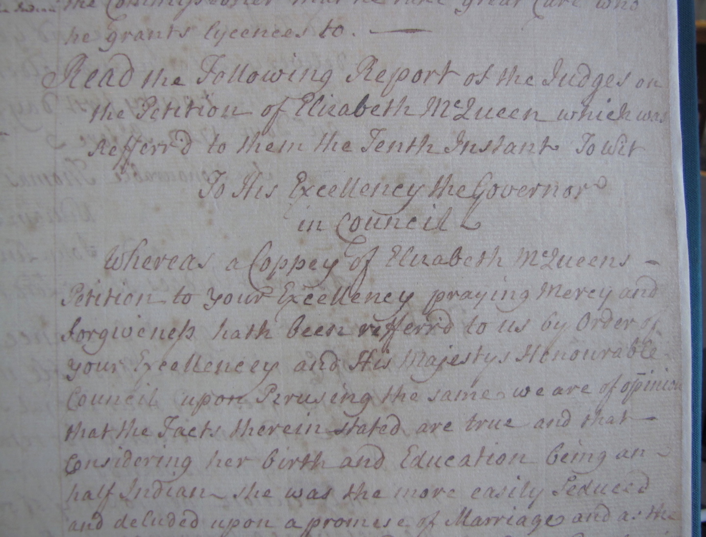 Whereas a Coppey [sic] of Elizabeth McQueens [sic] Petition to your Excellency praying Mercy and forgiveness hath been referr’d to us by Order of your Excellency and His Majestys [sic] Honourable [sic] Council upon perusing the same we are of opinion that the Facts therein stated are true and that considering her birth and Education being an [sic] half Indian she was the more easily seduced and deluded upon a promise of Marriage and as the majestrate [sic] who committed her and the People with whom she had lived for several years Past gave her a very favourable [sic] Character as to the Innocence and sobriety of her life before this Mellancholly [sic] and unhappy affair, We are therefore of opinion upon considering the Premises that the said Petitioner is no improper object of your Excellencys [sic] Mercy and Compassion, which is humbly submitted by your Excellency and Honours [sic] most obedient Servants