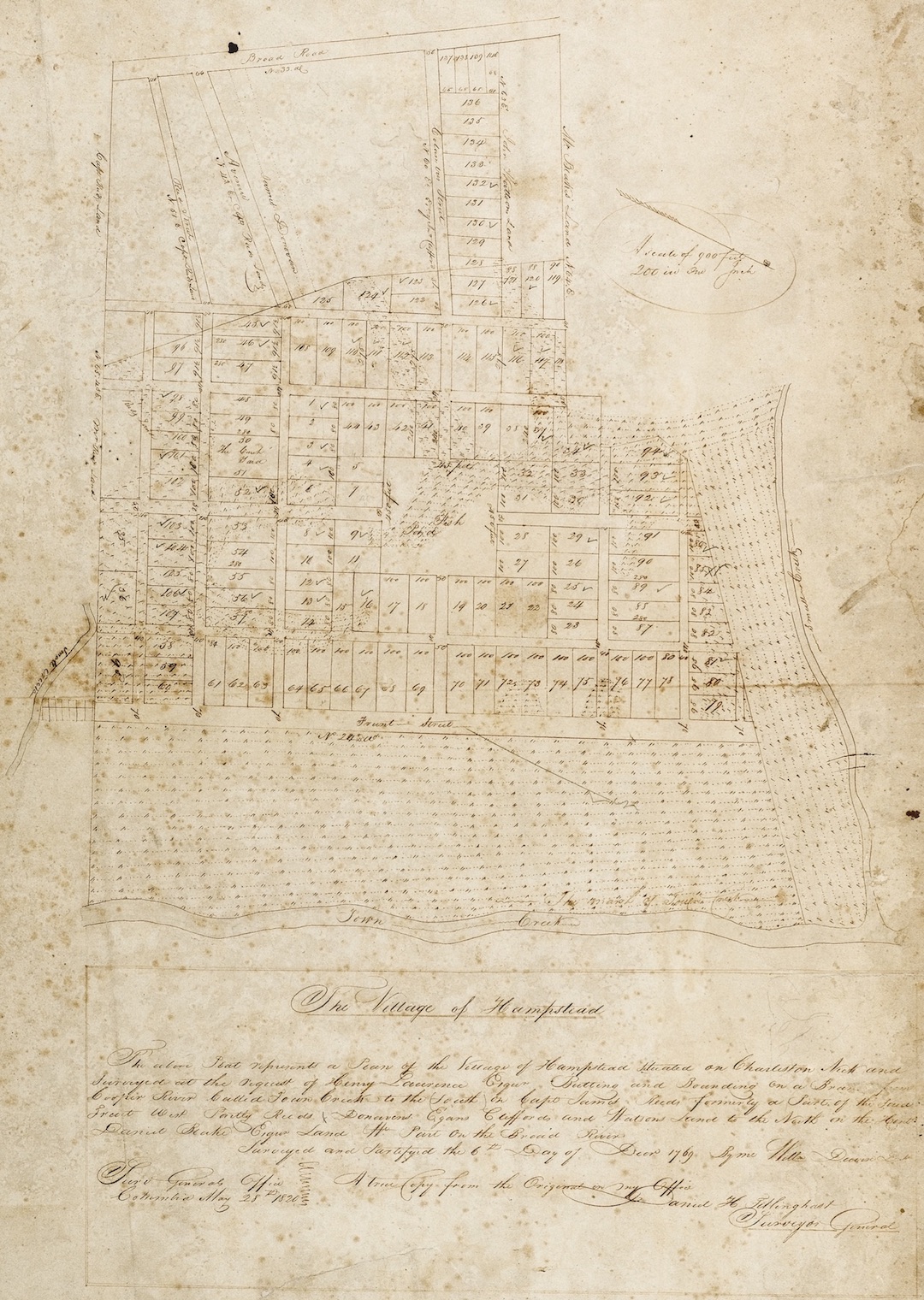 [1] Henry A. M. Smith, “Charleston and Charleston Neck: The Original Grantees and the Settlements along the Ashley and Cooper Rivers,” South Carolina Historical and Genealogical Magazine 19 (January 1918): 10–12; George C. Rogers, et al., eds., The Papers of Henry Laurens, volume 7 (Columbia: University of South Carolina Press, 1979), 589–95. A plan of "The Village of Hampstead," made by William Davis on 6 December 1769, survives as a copy made on 28 May 1820 by Daniel H. Tillinghast, Surveyor General; see South Carolina Department of Archives and History, Copies of Plats and Plans (S213187), volume 1, page 12.