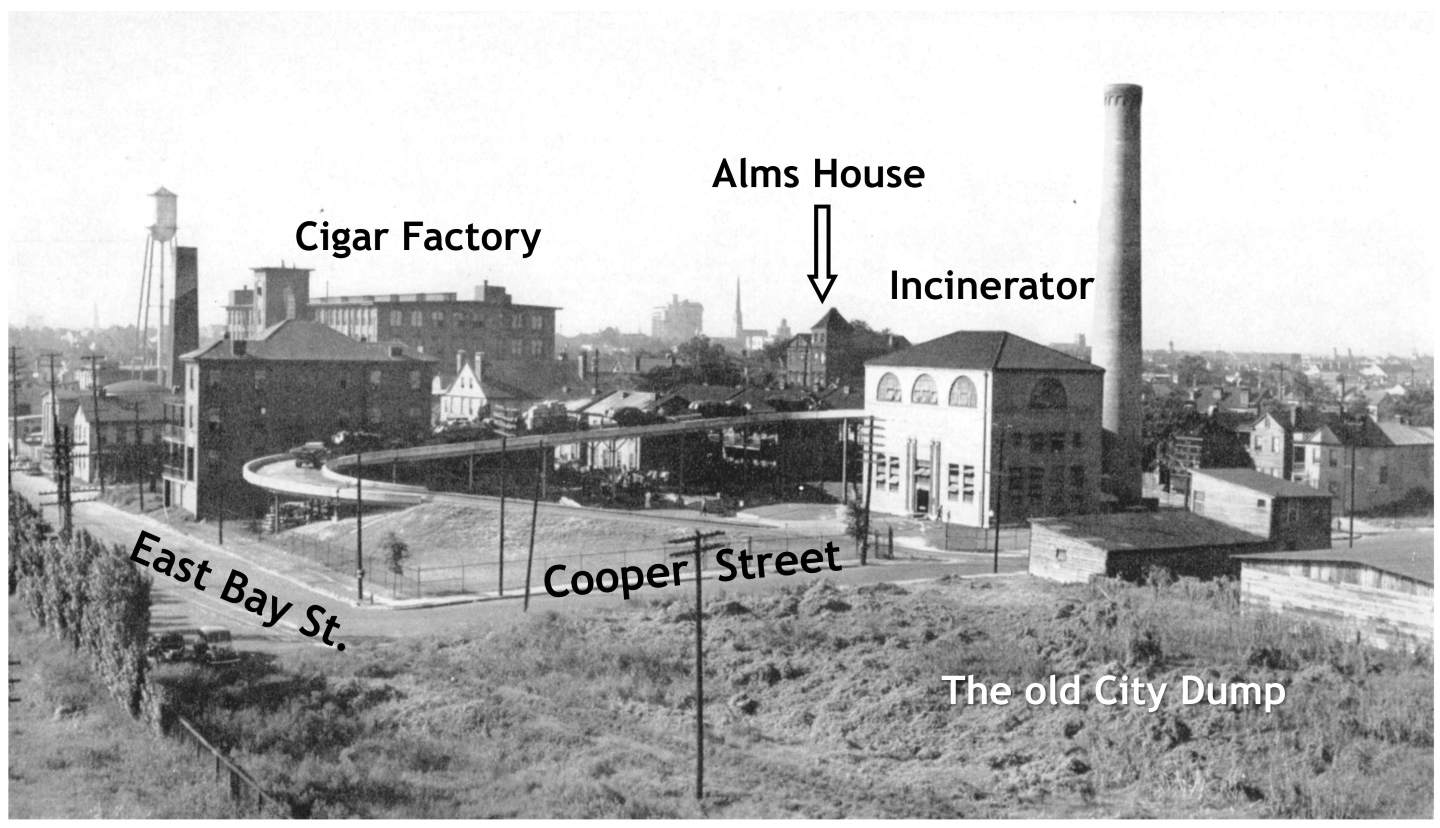 The era of prohibition in the 1920s and 30s gave rise to numerous opportunities for quick profits from illegal alcohol. Little Mexico, connecting the waterfront with the city’s main arterial streets, soon earned a reputation with the Charleston police as a nest of gin factories, flop houses, gambling dens, and criminal activity in general. One resident complained in 1925 that there was “shooting around there all the time.”[12] The opening of the first Cooper River Bridge in 1929, located on the northern edge Hampstead Village, further contributed to neighborhood’s transient and declining reputation. On the other hand, the bridge project also forced the city to clean up the sprawling and rat-infested open-air trash dump that the city had imposed on the neighborhood decades earlier. To accommodate this change, the City of Charleston built a municipal trash incinerator on the northern end of Hampstead Hill. Opened in 1935 and later expanded, the old incinerator’s tall brick smokestacks still form a very visible landmark today, next to the incinerator building now called the St. Julian Devine Community Center.