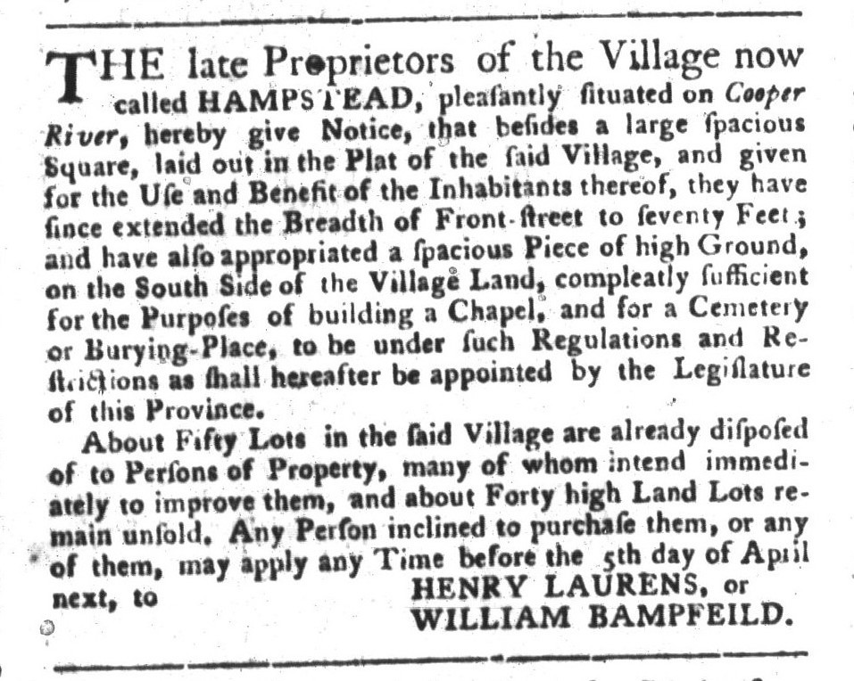 [3] See the general Hampstead advertisement in South Carolina Gazette and Country Journal, 13 March 1770, page 4; John Bull’s advertisement for Lots 72 and 73 in South Carolina Gazette, 31 December 1772.