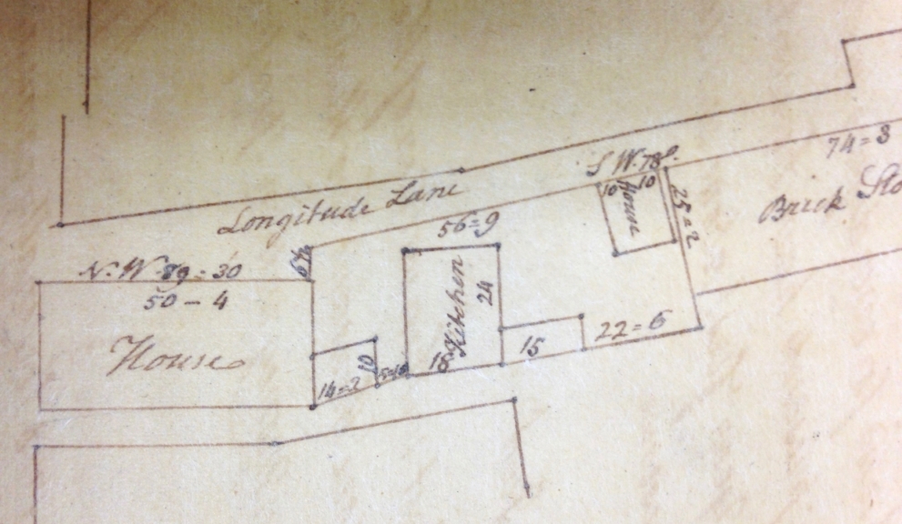 Over the years since 1762, Longitude Lane has changed a bit. It’s much straighter than it formerly was (see the 1778 plat above), and its width has changed with various uses over the years. From time to time, bollards have been placed in the middle of the lane to discourage vehicular traffic, and so it’s always been good place for a pedestrian-friendly stroll.