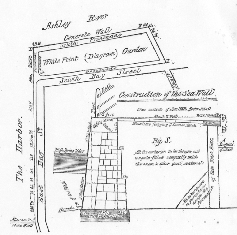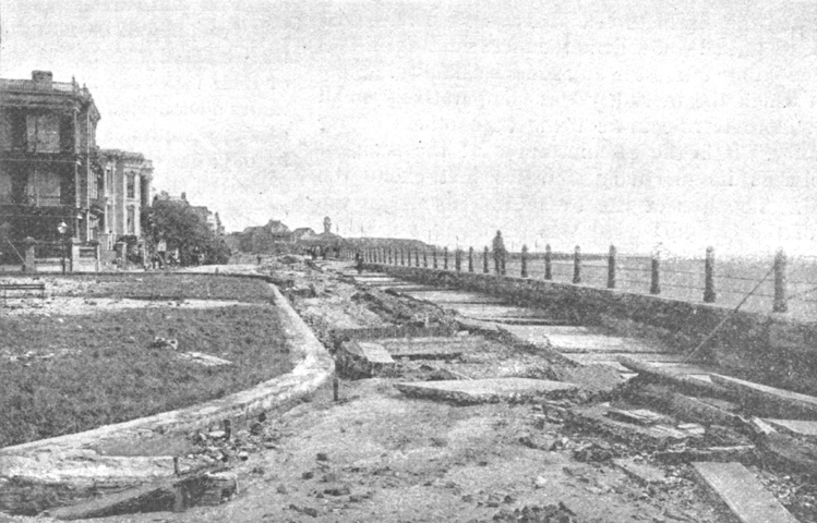 The saddest scene of all, however, was the magnificent sea wall on East Battery, now a mass of crumbling ruins. So violent was the force of the wind and waves that the huge paving stones with which East Battery was laid were taken up and hurled into the streets. The entire promenade is destroyed. In some places the walk was undermined by the waves and caved in. In other places it was completely washed away, the brick support on the street side being thrown down. The damage to the south walk is almost as great. The concrete wall of which this is formed was not so exposed as the stone wall on East Battery, and it therefore did not suffer as much. But the action of the water made deep ruts and holes in the shelled walk, and rendered it almost impassable. The grass on the sward [sic] too has a wilted appearance from being covered with water, and many of the granite posts and rails were swept away.