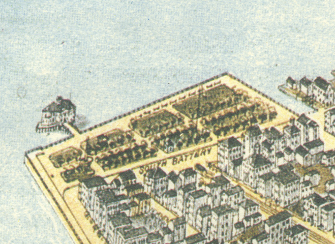 An 1872 bird's eye view map of the Battery with the Bathing House in place.