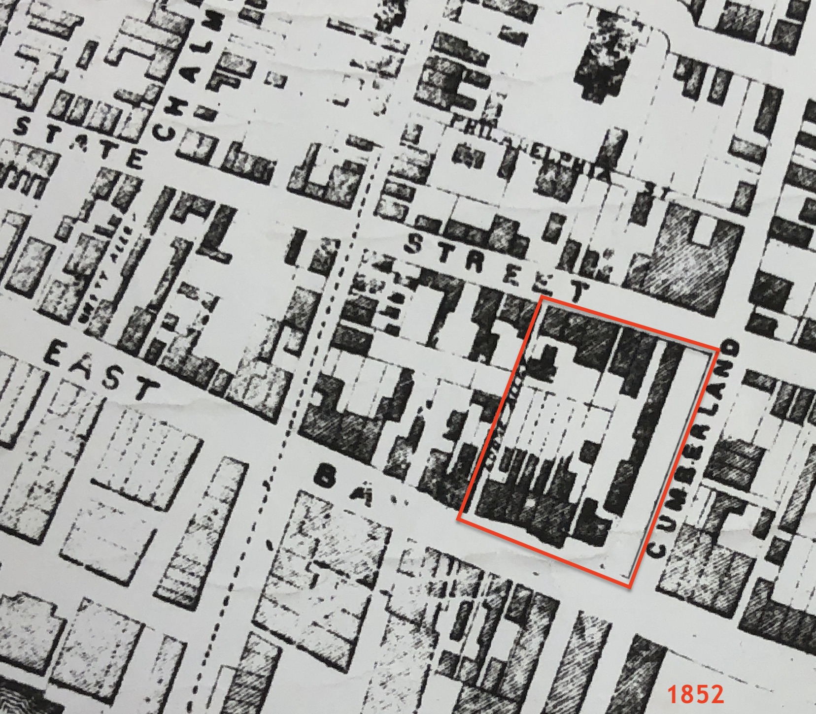 [20] A 1757–58 deed of partition of the estate of Joseph Wragg, which included property on both the north and south sides of Wragg Alley, is recorded in CCRD B3: 233–71. The widening and straightening of Cumberland Street, which involved the absorption of Amen Street, took place 1838–40.