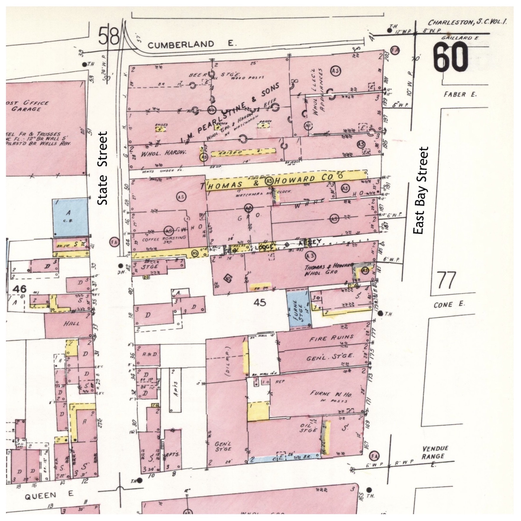So, how French is Charleston’s so-called French Quarter? The answer depends on how one defines its boundaries. First, let’s focus on the block defined by National Register listing of 1973. The land encompassed by Lodge Alley, East Bay, Cumberland, and State Streets includes parts of four lots defined in the 1672 Grand Model of Charleston: the northernmost parts of Lots No. 32 and No. 68, and the southernmost parts of Lots No. 33 and No. 75. Lodge Alley, formerly known as Simmons’ Alley, was created after 1713, when Francis Holmes purchased from Robert Daniel the northernmost part of Lot No. 32, containing 100 feet of vacant frontage along East Bay Street, and divided the land with his friend, John Simmons.[19] Each man sacrificed five feet of his respective half to create a passageway ten feet wide, but their object was not necessarily to facilitate traffic to and from nearby wharves. In fact, there were no wharves north of Queen Street at that time, and Queen Street, then known as Dock Street, was a watery thoroughfare that interrupted traffic along the Bay Street until the late 1730s. It’s more likely that Simmons’ Alley was created to facilitate passage from the northern end of the Bay Street to the southern part of the town, via a crooked, twenty-foot-wide passage known as Union Street (now State Street). Wragg Alley, created by merchant Joseph Wragg in the early 1700s, served a similar purpose before it was reconfigured in the late 1700s as Amen Street and then supplanted by the eastward extension of Cumberland Street circa 1840.[20] Modern State Street was created circa 1812, after a major fire in the neighborhood in 1810 provided an excuse to widen and straighten the narrow passage previously known as Union Street.[21]