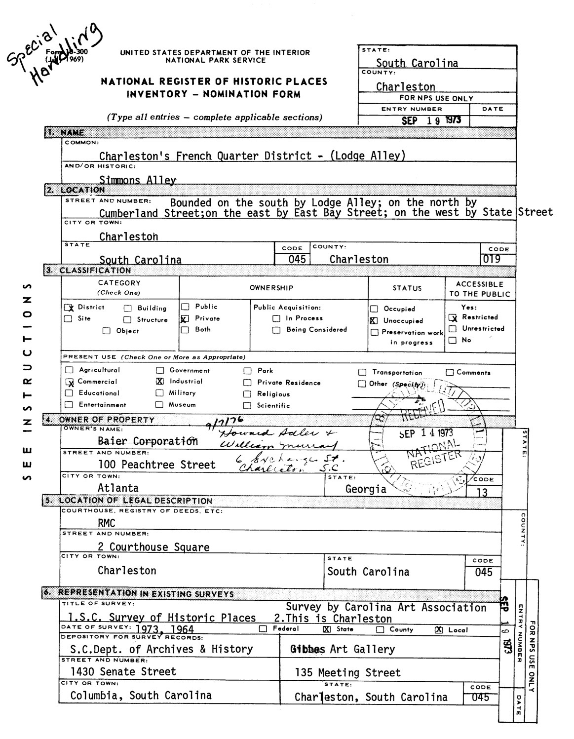 While the Save Charleston Foundation publicized its fundraising campaign in September 1973, the group pursued another strategy behind the scenes. Historical information about the property and buildings in question, gathered in Charleston by amateur historians, was forwarded to the state office of historic preservation at the South Carolina Department of Archives and History in Columbia. On September 4th, state preservation staff completed a form nominating the Baier property to the prestigious National Register of Historic Places. The application described the block bounded by Lodge Alley, East Bay, Cumberland, and State Streets as a singular entity with an unprecedented name: “Charleston's French Quarter District (Lodge Alley).” The official “Statement of Significance” presented several paragraphs of historical facts of dubious veracity that included just one sentence regarding the proposed name of the district: “Located in a section where the French Huguenots once lived and worked, Lodge Alley was a thruway for merchants working at the docks on East Bay Street.” In fact, most of the nomination text and supporting material refers to buildings and historical events located outside the stated physical boundaries, offering no further justification for the proposed name. A brief description of the site’s “Physical Appearance” simply asserts that “Lodge Alley is located in an area of the old walled city of Charleston where the French Huguenots once had warehouses and dwellings.”[13]