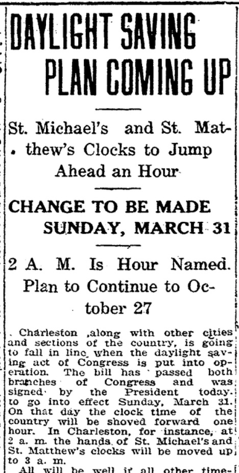 Finally, this brief history of time keeping in Charleston’s past brings us up to the spring of 1918. As the Great War in Europe dragged on, the various nations involved in that conflict began experimenting with a new practice of seasonal time adjustments. Germany started the trend in 1916, and other countries followed suit. The idea was relatively simple: Turn the clock ahead an hour in the spring to create longer days during the warmer, productive months, and turn them back an hour to normal “standard time” in the autumn. The principal motivation for this new practice was to conserve fuel for the war effort. With an additional hour of daylight during the most productive months, one would burn less coal and generate less electricity. The surplus coal could be allocated for military purposes, and the war might conclude a bit sooner. After Britain signed on to the new concept, the United States soon followed her lead. On Sunday, the 31st of March, 1918, the people of Charleston and the rest of the nation awoke to a new era of annual clock fiddling that we call “Daylight Saving Time.” The Great War ended in November, 1918, just after the conclusion of the first summer of “Daylight Saving,” but the practice of turning our clocks forward and back each year has persisted, with minor changes, for the past century.