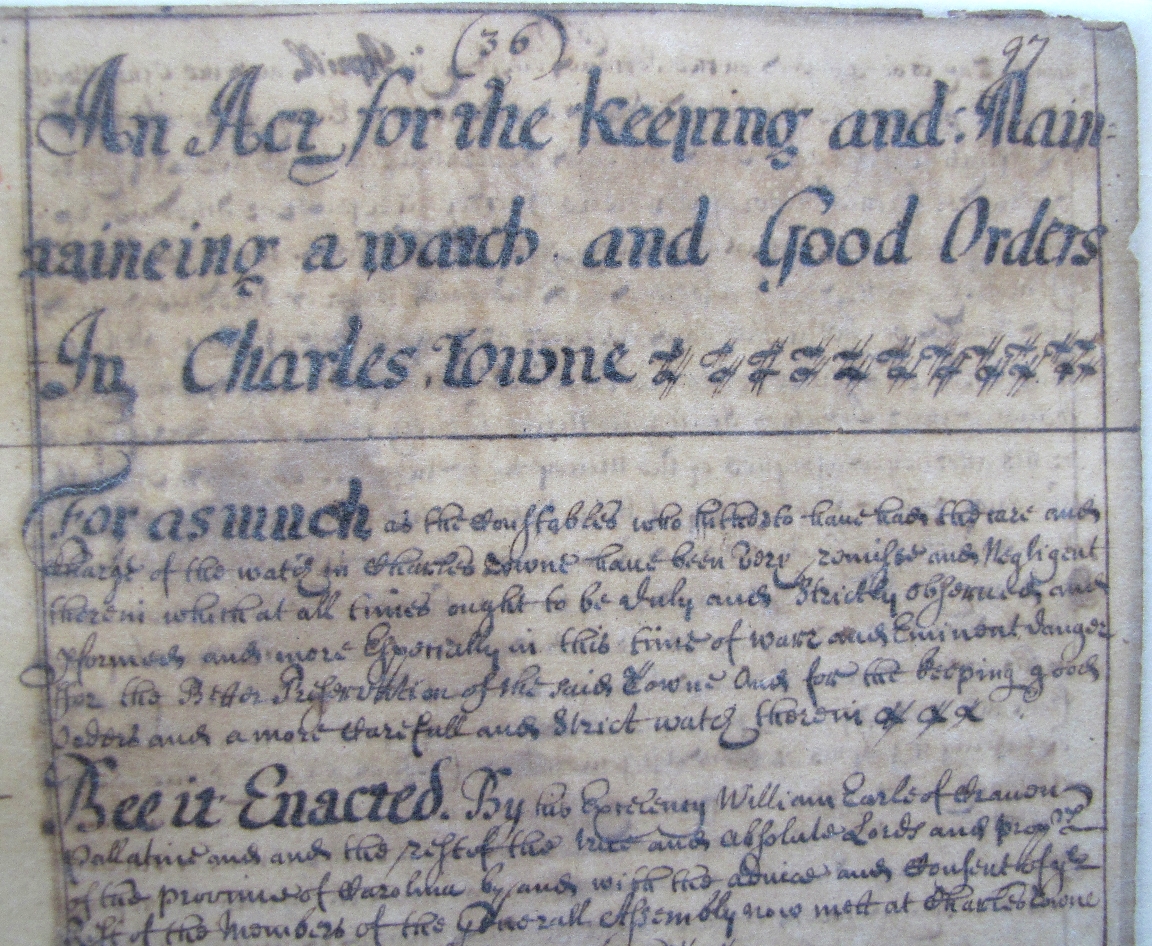 In the ensuing year, however, reports of political and legal abuses perpetrated by Sothel’s administration reached the Lords Proprietors of Carolina back in England. In September 1691 the Proprietors sent orders to Charleston that all of the acts passed by his “pretended Parliaments” had been disallowed, but it was not until April 1692 that Governor Sothel was removed from office and the Grand Council of South Carolina formally dissolved.[15] When the vestiges of the Grand Council met again June 1692 to consider temporary means of restoring order to South Carolina, one of their first concerns was the enactment of proper laws to regulate the watch. For the “present preservation of the counttrey,” the provisional government ordered that “the measure and rule of Government shall be the Laws of England. . . together wth: such orders and ordinances for the better preservation of the publique peace as shall be from time to time made and published” by the subsequent legitimate government of South Carolina. Accordingly, the interim government’s first action was to order “thatt all persons capable of bearing armes in Charles Towne doe performe theire duetyes in the Constables watch in theire respective turnes and all houses that have nott an inhabittant capable of bearing armes shall furnish [a substitute] to the watch in theire turnes under the penalty of twenty foure howers close imprissonment for every default.”[16]
