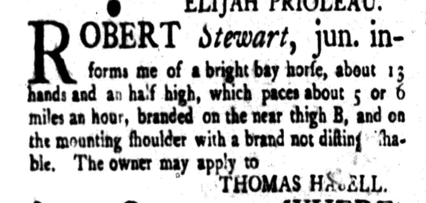 [6] For a discussion of horse locomotion and speed, see Susan E. Harris, Horse Gaits, Balance, and Movement (Nashville, Tenn.: Turner Publishing Company, 2016); South Carolina Gazette (hereafter SCG), 15 August 1753; SCG, 26 March 1744; SCG, 17–24 March 1764.