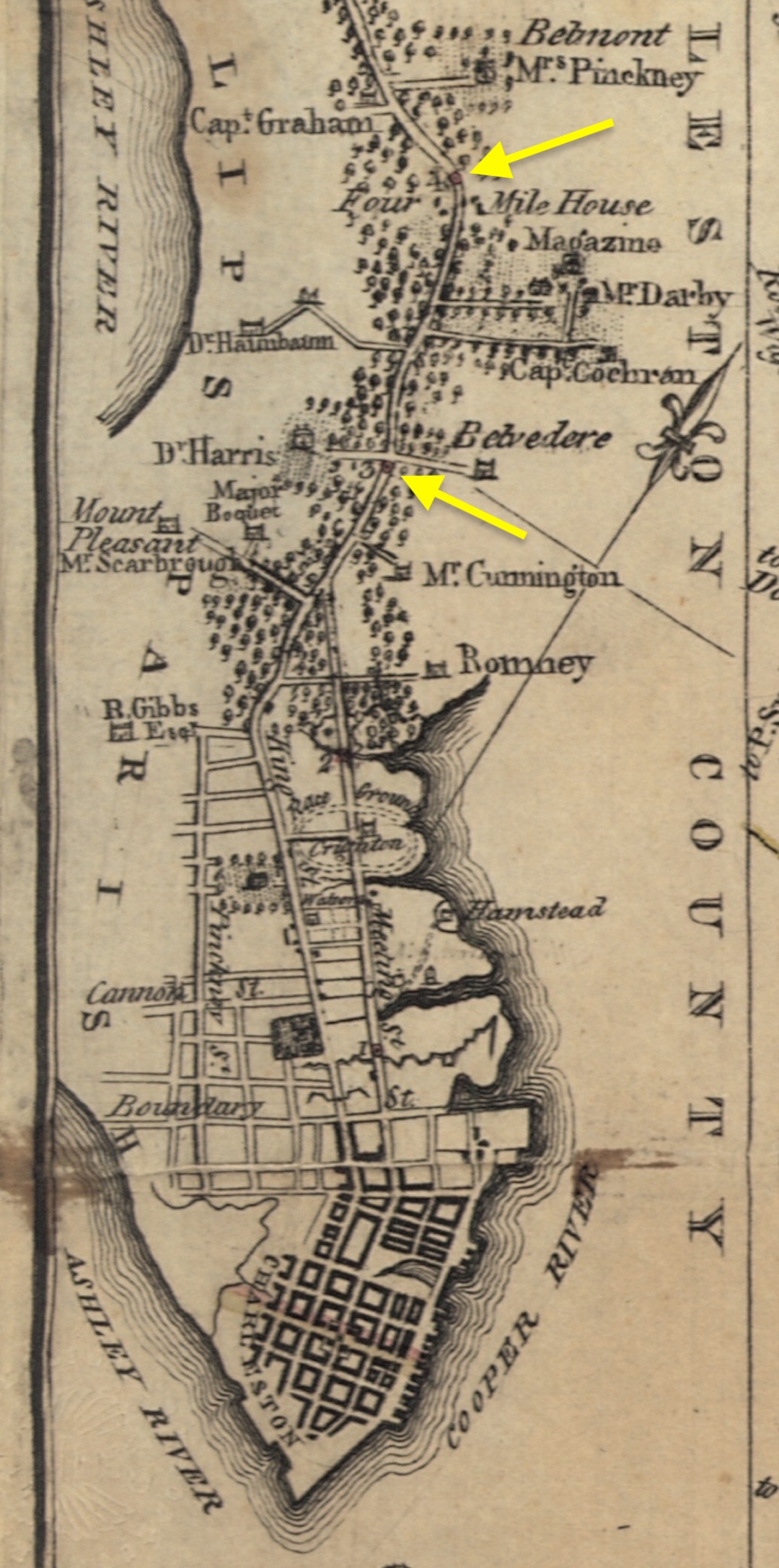 [12] The three-mile stone and other mile-markers appear on Thomas Abernethie’s “Road to Watboo Bridge from Charleston” (Charleston, S.C.: Walker and Abernethie, 1787), a copy of which can be found on the website of the Library of Congress.