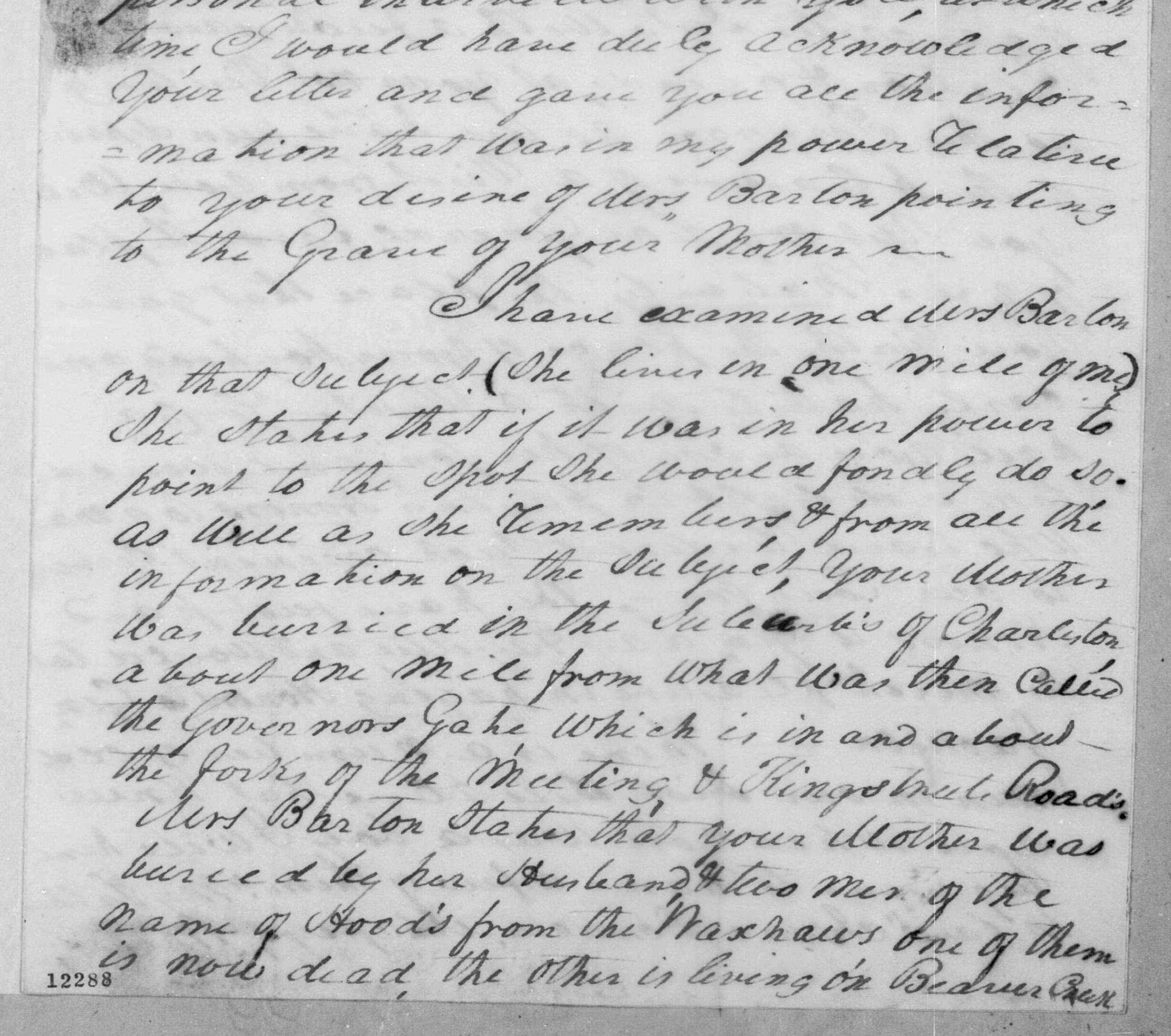 “I have examined Mrs. Barton on that subject, (she lives in one mile of me)[.] She states that if it was in her power to point to the spot she would fondly do so; as well as she remembers, and from all the information on the subject, your mother was burried in the suburb’s of Charleston, about one mile from what was then called the Governors Gate, which is in and about the forks of the Meeting and Kingstreet Road’s.