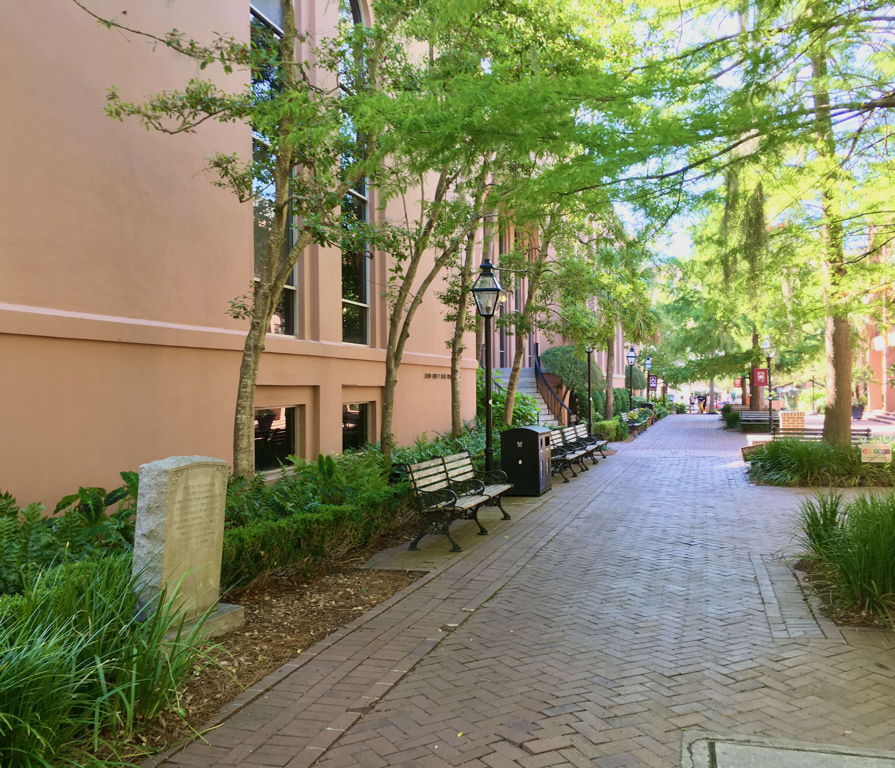 No one writing in 1967 proposed to move the memorial stone to the geographically appropriate spot on Charleston Neck, which was then an industrial brown zone populated by junkyards, dive bars, and gentlemen’s clubs catering to the enlisted men stationed at Charleston Navy Yard. Instead, the agitators agreed to accept an invitation from Walter R. Coppedge, President of the College of Charleston, who offered to host the 1942 memorial stone on the school’s newly-landscaped Cougar Mall. Without ceremony in August 1967, the twenty-five-year-old marker quietly moved to its new home just a few yards south of Calhoun Street, a short distance west of St. Philip Street, where it still stands today.[20]