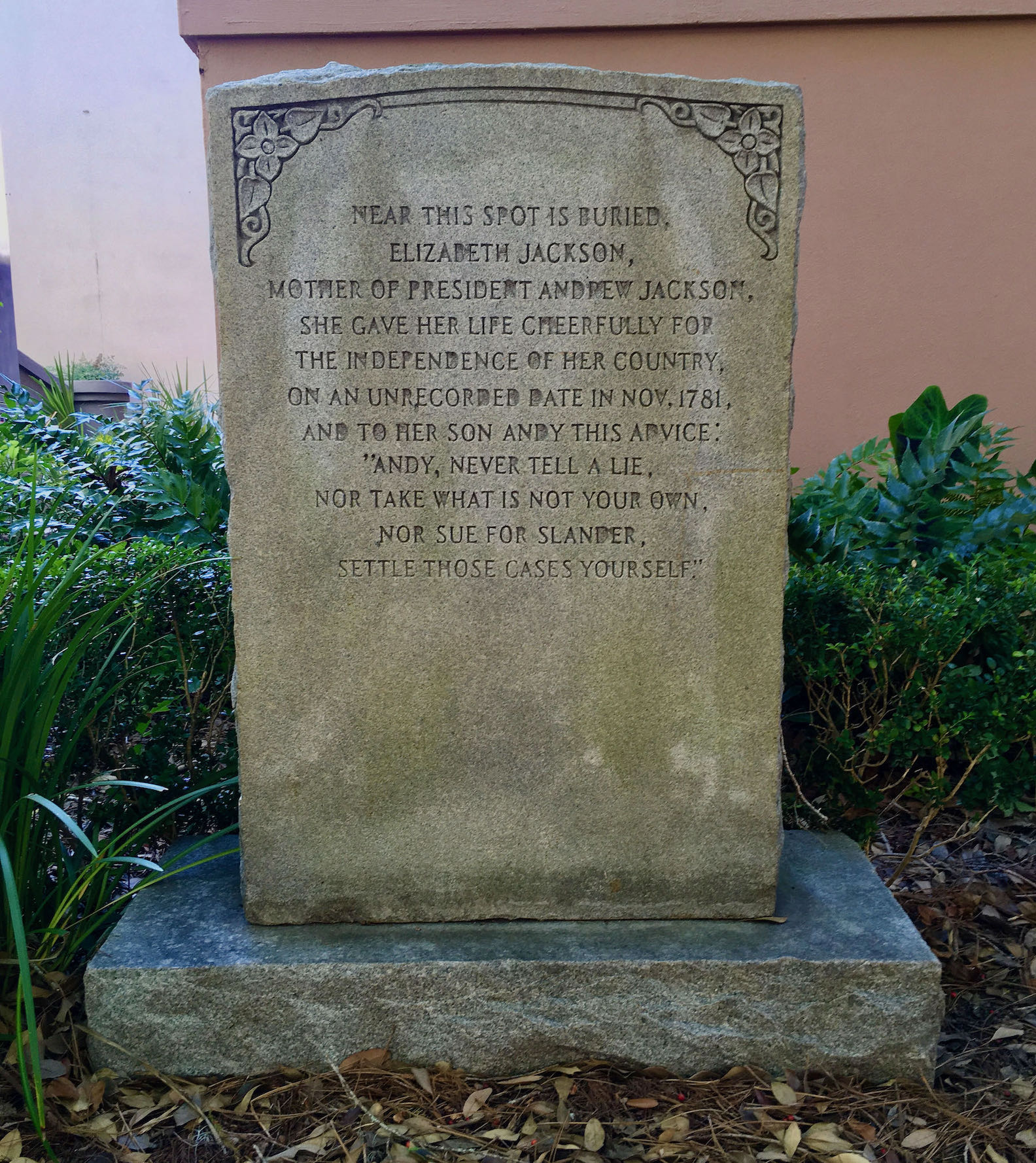 Over the past fifty-odd years, thousands of students and visitors have walked past the marker dedicated to Elizabeth Jackson and read the words inscribed in granite in 1942: “Near this spot is buried Elizabeth Jackson, mother of Andrew Jackson, she gave her life cheerfully for the Independence of her country, on an unrecorded date in Nov. 1781, and to her son Andy this advice: ‘Andy, never tell a lie, nor take what is not your own, nor sue for slander, settle those cases yourself.’”
