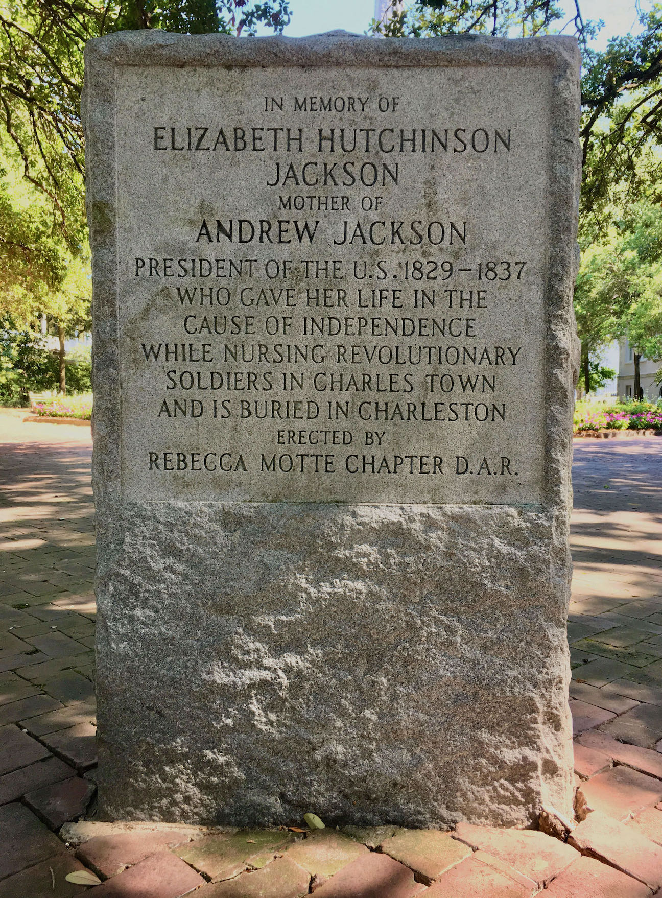 Elizabeth Hutchinson Jackson, a native of Ireland aged about forty years, came to Charleston in the summer of 1781 to assist captive soldiers who needed a helping hand to get back on their feet. She died shortly after her arrival and was buried by friends at a quiet suburban site approximately three and a half miles north of the granite marker on the campus of the College of Charleston. The precise location of her grave is lost, but two granite markers within the city encourage residents and visitors to recall her legacy. We remember Elizabeth Jackson as the mother of a future president of the United States and as a hero of the American Revolution. Her selfless courage exemplified the sacrifice offered by so many unsung women during this nation’s struggle for independence.