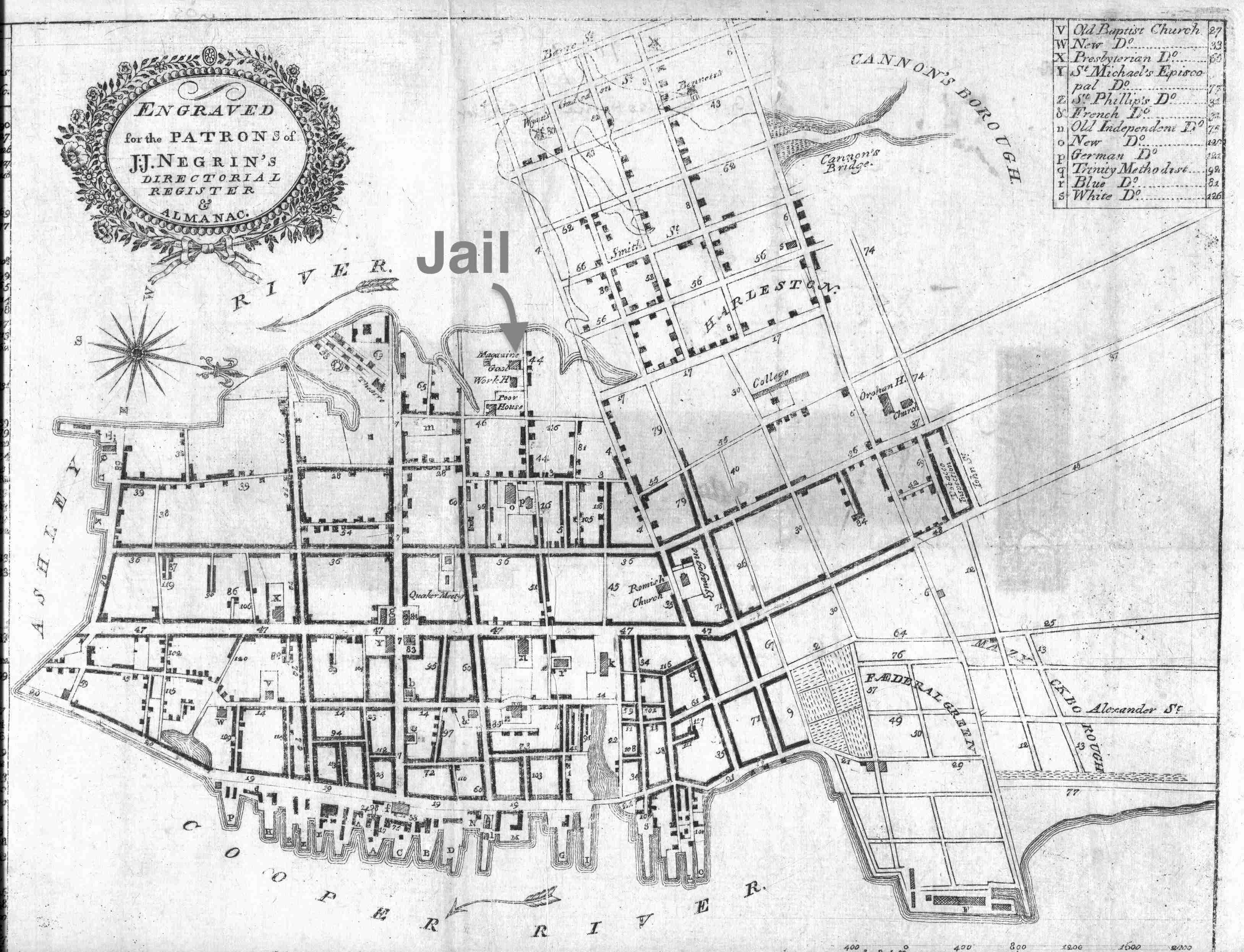[1] Southern Patriot, 14 February 1820, page 2, says Albro was “committed to Jail” on Sunday; Charleston Courier, 14 February 1820, page 3, says he was “committed to the jail in this city, yesterday morning.” This institution is frequently referred to as the “city jail,” but that name is incorrect. The Charleston city jail, located within the Guard House at the southwest corner of Meeting and Broad Streets, was used to detain persons arrested by the City Guard or the City Sheriff within the city limits during the hours of the nightly curfew. Such prisoners were arraigned in the morning and either fined, bailed, or remanded into the custody of the District Sheriff at the District Jail for later trial.