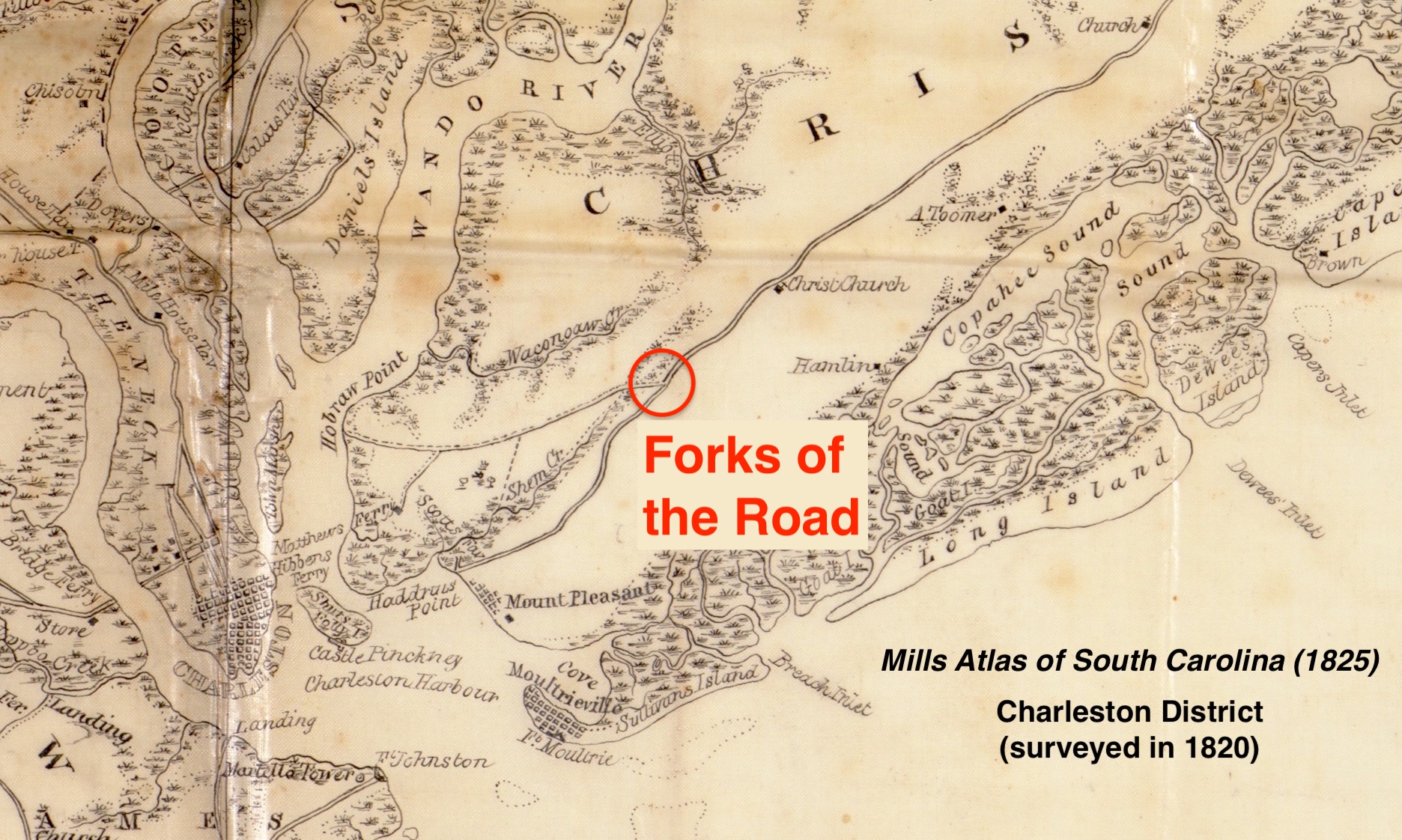 Albro’s brief stay of execution ended on Saturday, March 4th, 1820, on which date he made one final journey from the Charleston District Jail, across the Cooper River ferry, to Haddrell’s Point. From there he was transported, probably in a horse-drawn cart and escorted by local cavalry militiamen, northward on the main road leading toward Georgetown. The slow-moving cavalcade traveled just three and a half miles up the road, however, and stopped at a fork in the road familiar to past and present inhabitants of Christ Church Parish (encompassing the modern town of Mount Pleasant).