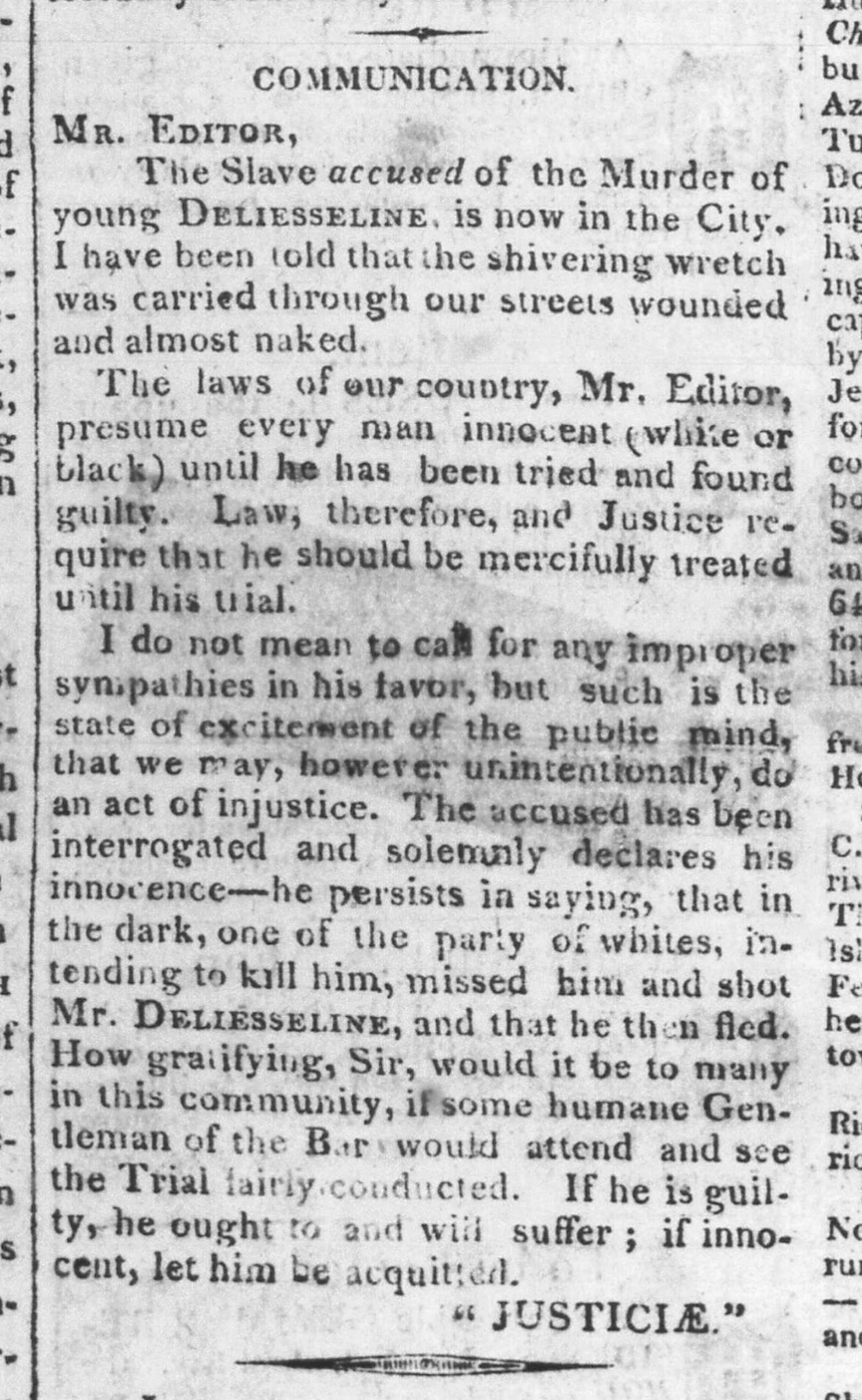 “Mr. Editor, The slave accused of the murder of young Deliesseline, is now in the City. I have been told that the shivering wretch was carried through our streets wounded and almost naked.