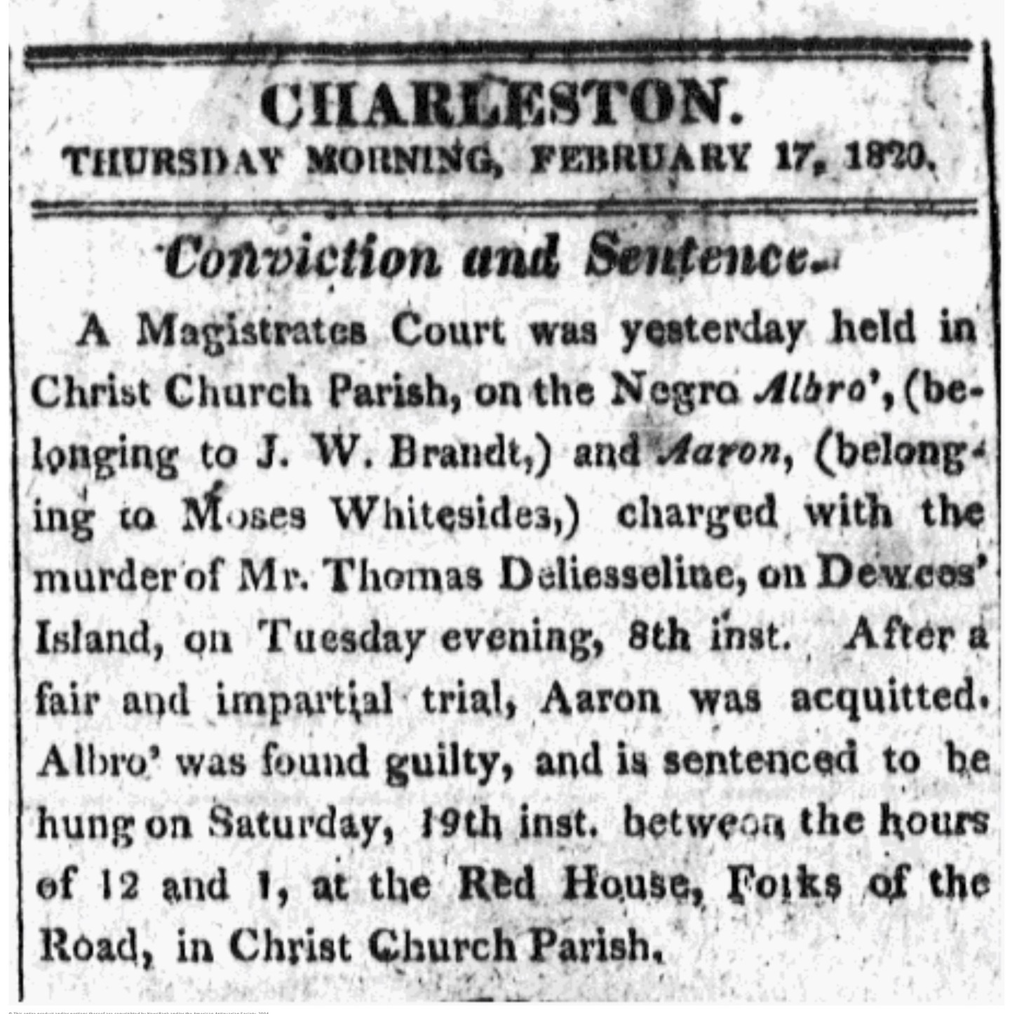 Albro, an enslaved runaway, had murdered Thomas Deliesseline while trying to flee from Dewees Island on Tuesday, February 8th, 1820. Local authorities initiated a manhunt the following day to track the fugitive across the island and to mainland of Christ Church Parish. He was shot at and wounded the following Friday night while attempting to hide on a seaside plantation near Copahee Sound, and then captured the following evening on another plantation belonging to James Hibben, where he had sought shelter within a slave cabin.