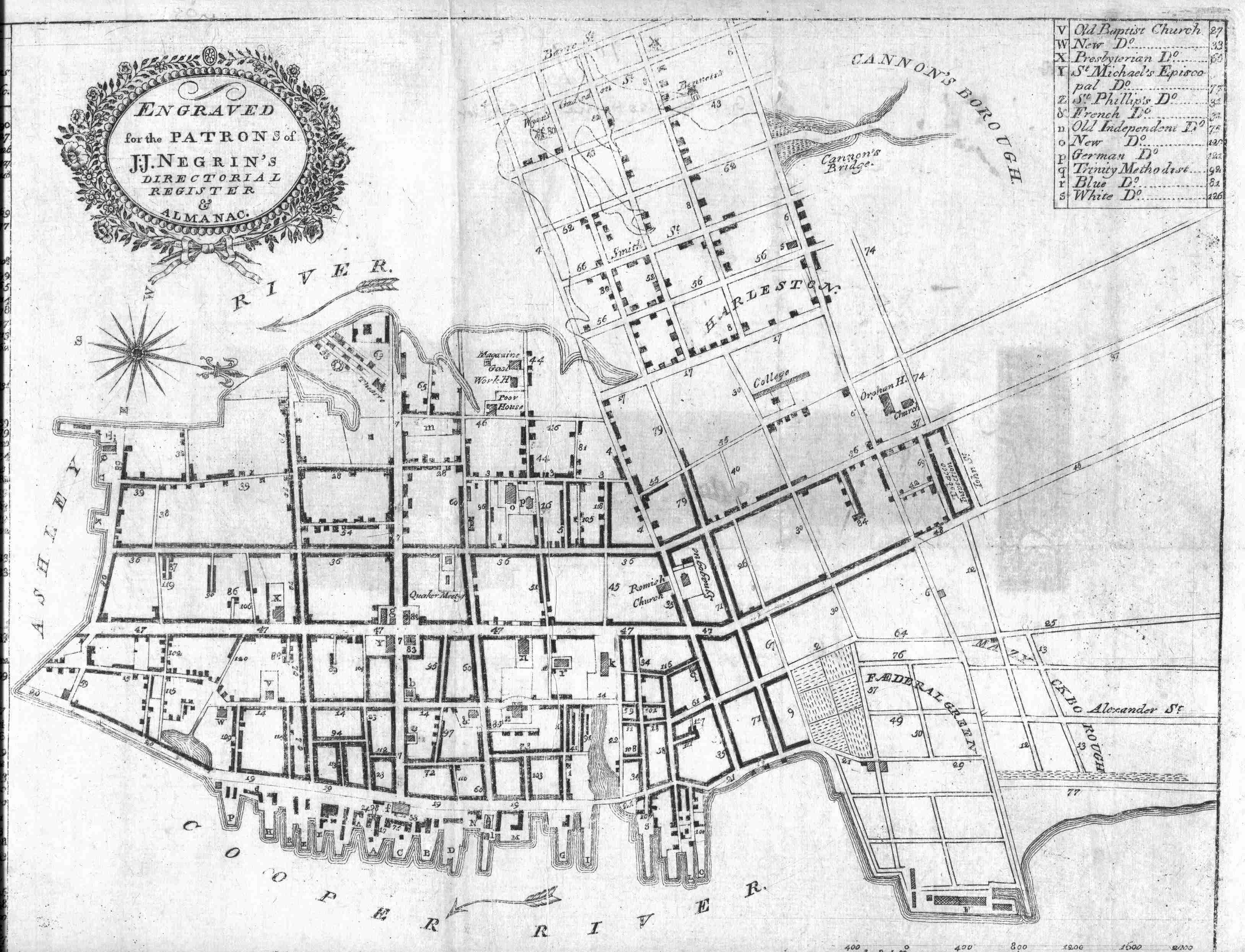 [2] Schenk and Turner’s 1819 Directory and Stranger’s Guide identifies Gov. Geddes’s residence as 98 Broad Street. According to Jonathan Poston, The Buildings of Charleston (Columbia: University of South Carolina Press, 1998), 162–63, Geddes owned the properties now re-numbered as 56–58 and 60–64 Broad Street.