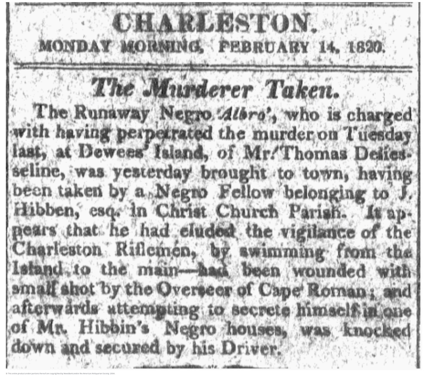 [13] Albro’s capture is described in City Gazette, 14 February 1820, page 2; Courier, 14 February 1820, page 3; Southern Patriot, 14 February 1820, page 2. James Hibben’s Seaside or Sea Side plantation (distinct from a nearby plantation of the same name belonging to the Barksdale family) is described in Natalie Adams Pope, Phase I Archaeological Survey of the Rifle Range Road Tract, Charleston County, South Carolina (New South Associates Technical Report 2235, September 2013).