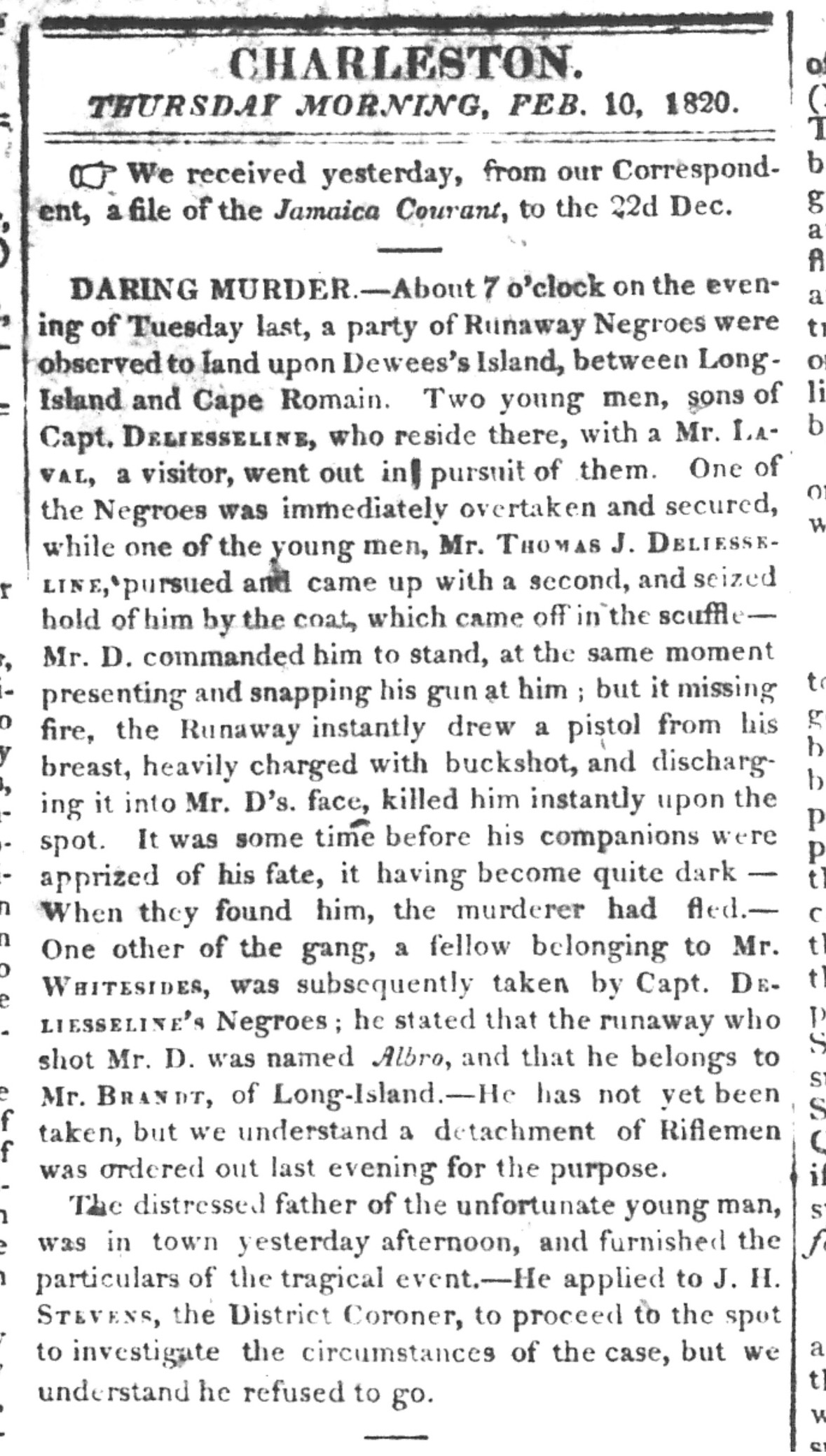 Let’s begin today’s program with a brief review of last week’s episode. Albro, formerly known as Fulliman, was a native of Africa who was brought to South Carolina at the beginning of the nineteenth century and enslaved on Long Island (now called the Isle of Palms). He fled from captivity on several occasions over the years, and was traveling with a band of fellow fugitives in the early days of 1820. After landing in a boat on Dewees Island on the night of Tuesday, February 8th, Albro was pursued by a young man named Thomas Deliesseline, whose father owned a plantation on the island. Thomas accosted the runaway and attempted to shoot him with a gun that misfired. Albro instantly retaliated with a pistol shot that ended the White man’s life.