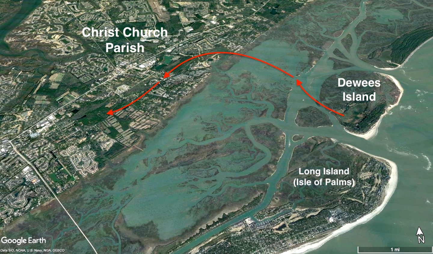 The movements of Albro’s unidentified fellow fugitives is a mystery, but the enslaved man named Aaron, captured shortly after the murder of Thomas Deliesseline, was still being held by the victim’s family on Dewees Island. Aaron knew as little of Albro’s escape route as the militiamen now combing the island, however, since he had lost sight of the alleged gunman in the darkened chaos of Tuesday evening. In reality, Albro had already slipped away from Dewees Island at some point between Wednesday morning and Thursday evening. He probably bobbed in the shallow ocean water for many hours, hiding among the salt marshes and waiting for an opportunity to swim quietly towards the mainland. The distance from the back side of Dewees Island to the adjacent shore line is nearly two miles, but the most direct path across Copahee Sound is interrupted by a maze of meandering saltwater marsh. Swimming in short bursts from one grassy mudbank to another, Albro might have conserved his energy and remained virtually invisible to passing boats.
