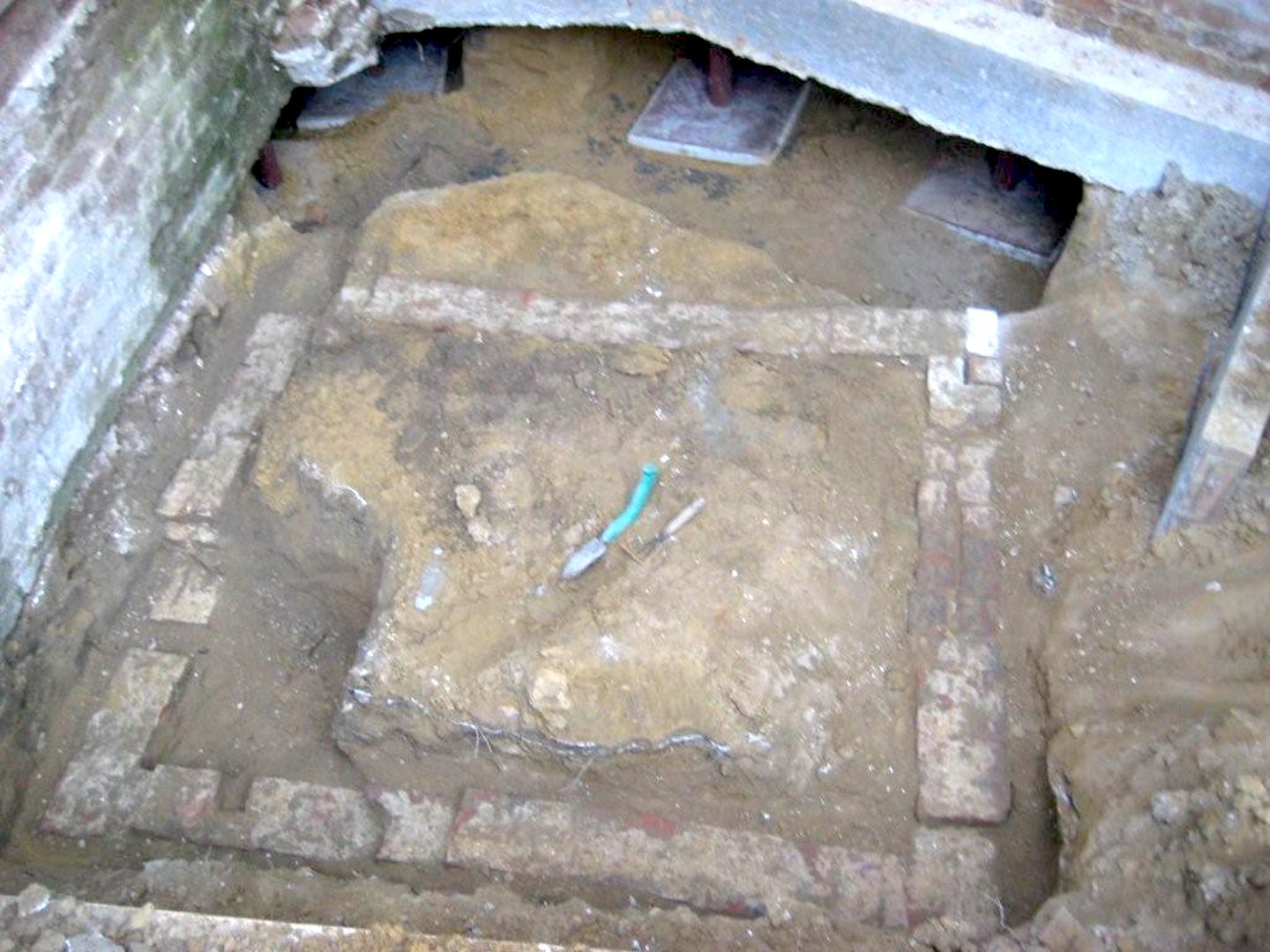 In March 2008, workers began preparing for the construction of a new elevator shaft in the northwest corner of the theater’s outdoor courtyard, which lies immediately to the south of the theatre’s rear wall. To install the elevator shaft, they had to cut into a concrete slab that had been poured several decades earlier. After removing a ten-foot square of concrete and excavating three feet of earth beneath it, workers encountered a rectangular brick foundation measuring approximately six feet by eight feet. The construction supervisor recognized this foundation as a potentially historic structure, so he called in local archaeologists to get their opinion. The brickwork was likely the remnants of an old privy, or outdoor toilet structure, said the experts, but its age was unclear. Because most early Charlestonians routinely deposited household trash in such outhouses, however, an examination of the coal-black earth within the brick privy might reveal information about its chronology and the character of the people who once inhabited this site.