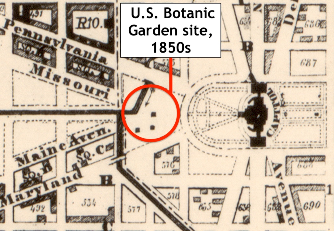 [16] Karen D. Solit, History of the United States Botanic Garden 1816–1991 (Washington, D.C.: U.S. Government Printing Office, 1993), 17–31; Fallen, Anne-Catherine Fallen, A Botanic Garden for the Nation: The United States Botanic Garden (Washington, D.C.: U.S. Government Printing Office, 2007), 20–29. The Botanic Garden complex of the 1850s was dismantled in 1933 and removed to the present site on the south side of the Capitol complex. The site of the 1850s conservatory of the U.S. Botanic Garden is now under the Capitol Reflecting Pool, which forms part of Union Square on the west side of the Capitol Building.