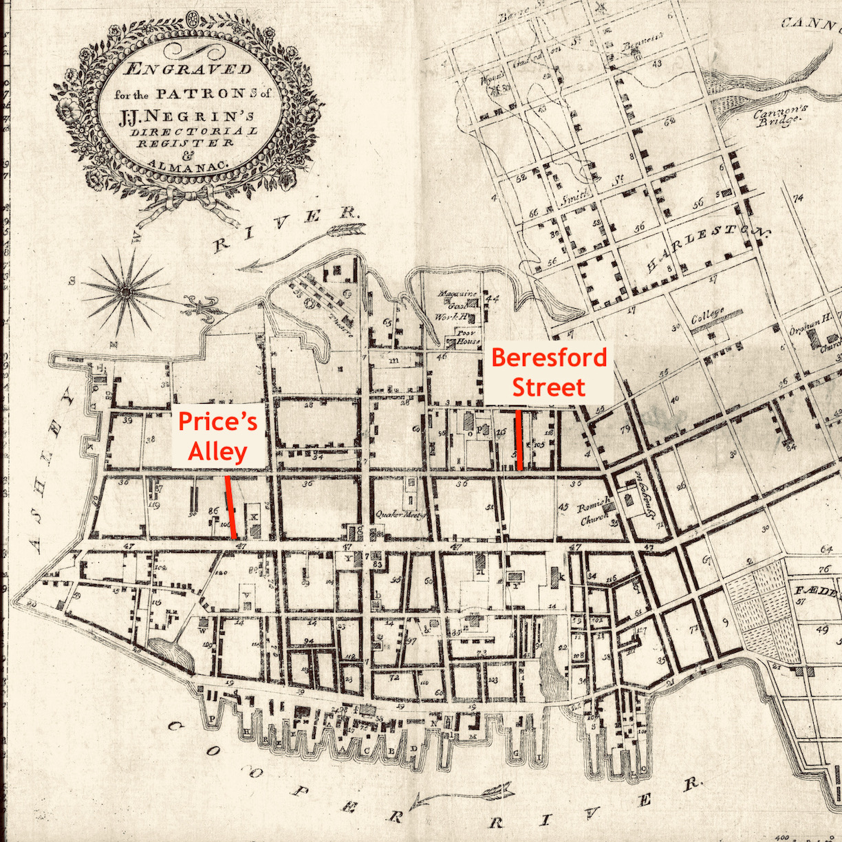 Within the urban confines of the City of Charleston, forty-odd miles east of Greenfield, Thomas chose an unconventional site to house his unconventional family. In a series of transactions executed after the American Revolution, Pinckney purchased several lots on the south side of Price’s Alley, where he apparently built a family residence and one or more rental tenements.[13] This narrow alleyway, which stretches nearly five hundred feet between Meeting and King Streets in urban Charleston, was created in 1749 as a causeway along the northern edge of what was once a large tannery owned by a merchant named Hopkin Price. After the death of Mr. Price in 1781, the State of South Carolina seized his estate, divided the soggy tannery grounds into thirteen lots, and sold them at auction in June 1783.[14] Several prominent business men of that era purchased building lots in Price’s Alley for investment purposes and erected cramped rental tenements that were leased to working-class tradesmen and free people of color. In short, Price’s Alley was not the sort of place one might expect to find the brother of the Governor of South Carolina at the end of the eighteenth century.