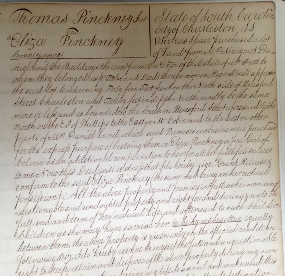 The earliest known document concerning the young mulatto woman named Eliza Pinckney dates from December 1807, at which time I believe she was approximately eighteen or nineteen years of age. The document in question, a deed created by Thomas Pinckney, identifies her as a “free girl of colour” who was significantly younger than the forty-seven-year-old planter. On Christmas Day, Thomas presented the furnished residence on Beresford Street to Eliza Pinckney as a gift and “as an additional compensation to her for all her faithful services to me.” He stated that the premises in question, including the land and the buildings, “were purchased for the express purpose of bestoing [sic] them on Eliza Pinckney.” Henceforth, he empowered her to regard the property “as her own unquestionable and undoubtful property and right” for the rest of her life. After her death, Thomas ordered that the property should be shared equally by “such children, or children as she may have survive her, to be by me begotten” (emphasis original).
