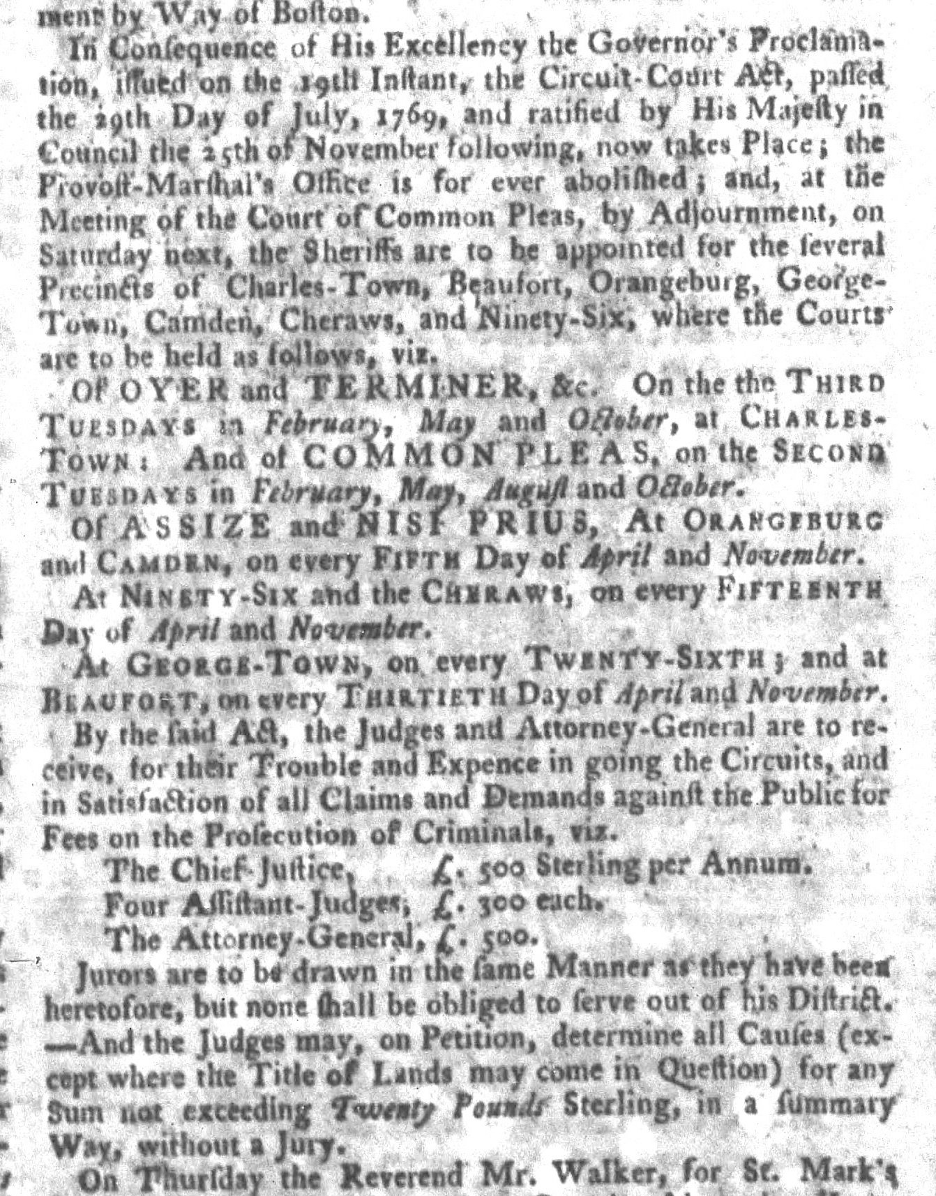 [17] See section 1 of Act No. 980, “An Act for establishing Courts, Building Gaols, and Appointing Sheriffs and other Officers, for the more convenient administration of justice in this province,” ratified on 12 April 1768, in McCord, Statutes at Large, 7: 197–205; “An Act for establishing Courts, Building Goals [jails], and Appointing Sheriffs and other Officers, for the more convenient Administration of Justice in this Province,” ratified on 29 July 1769, in John Faucheraud Grimke, ed., The Public Laws of the State of South-Carolina (Philadelphia: R. Aitken, 1790), 268–73.