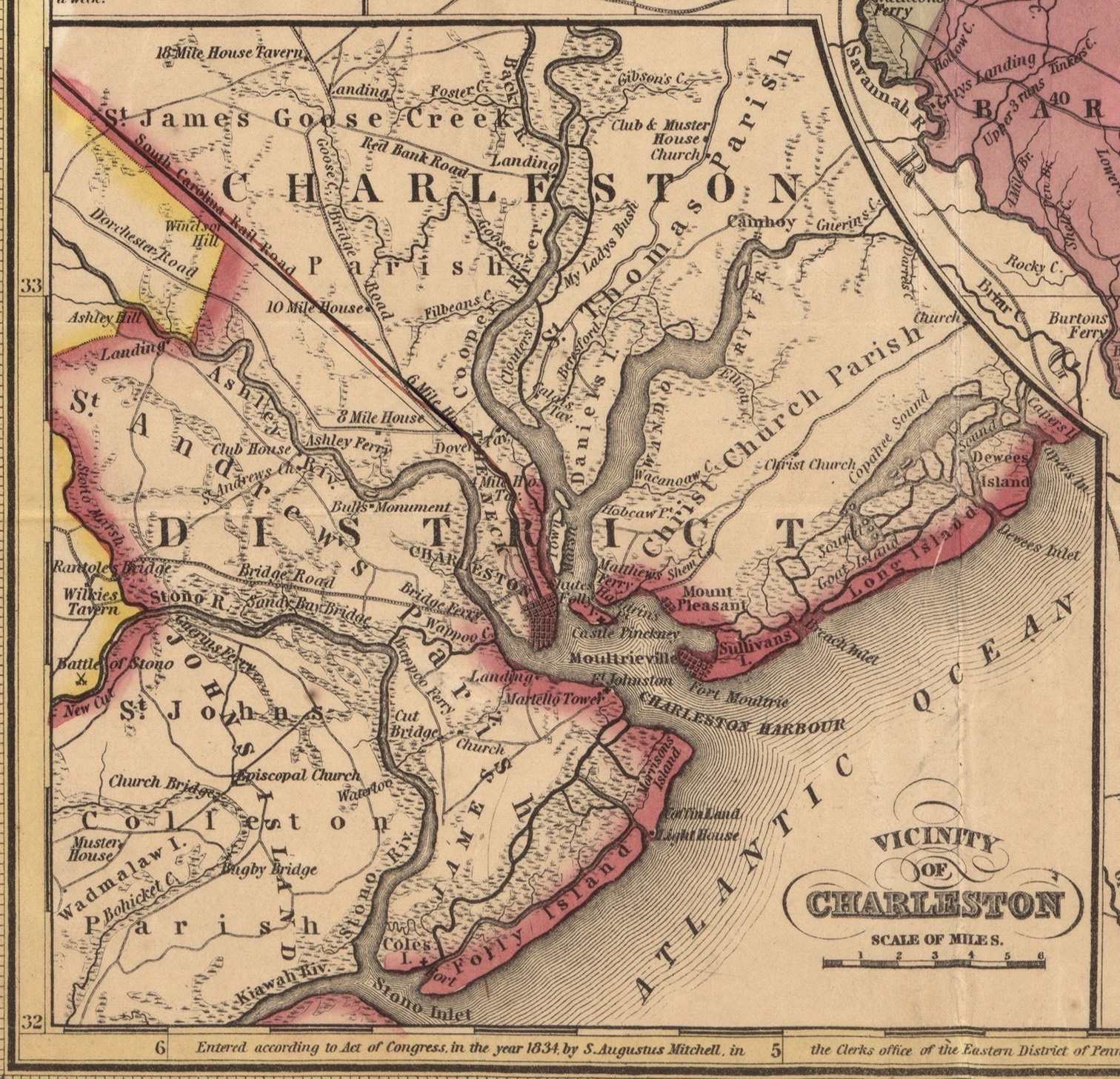 Proceeding north to south, South Carolina’s original parishes included St. James, on the Santee River; Christ Church, in the area now called Mount Pleasant; St. Thomas and St. Dennis (later spelled "Denis") were initially separate parishes, but were soon collapsed into a single entity that encompassed Daniel Island and the mainland between the Wando and Cooper Rivers; St. John, Berkeley, was situated on the northwestern reaches of the Cooper River; St. James, in the area surrounding Goose Creek; St. Philip, encompassing the neck of land between the Ashley and Cooper Rivers; St. Andrew, between the Ashley and Stono Rivers; St. Paul, between the Stono and the South Edisto Rivers; and St. Bartholomew, between the South Edisto and Combahee Rivers.[3]