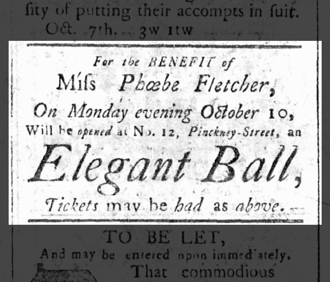 I have not yet found any reference to Phebe Fletcher among the sparse extant records of life in Charleston during the years immediately after the British evacuation of December 1782. In the autumn of 1785, however, a local newspaper published a notice related to an undocumented series of curious cultural events. An advertisement in the Charleston Evening Gazette invited the community to “an elegant ball” to take place on the evening of October 10th at what was then called No. 12 Pinckney Street (a building now long gone). The soirée was described as being “for the benefit of Miss Phœbe Fletcher,” but this was no a charity event. Rather, it was probably the conclusion of a subscription series of entertainments for which she played the role of both hostess and performer. As commonly seen in theatrical and concert series of that era, the “benefit” in question was a sort of gratuitous reward for Phebe’s hospitality and/or management of the series.[6]