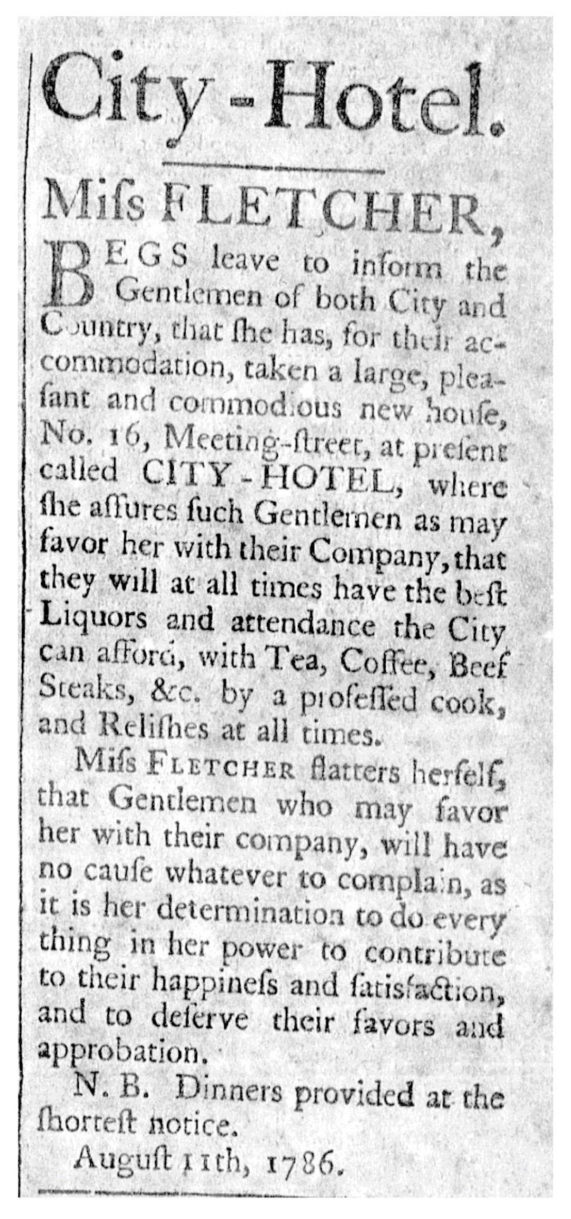 In mid-August 1786, “Miss Fletcher” advertised in local newspapers “to inform the gentlemen of both city and country, that she has, for their accommodation, taken a large, pleasant and commodious new house, No. 16, Meeting-street, at present called CITY-HOTEL, where she assures such gentlemen as may favor her with their company, that they will at all times have the best liquors and attendance the city can afford, with tea, coffee, beef steaks, &c. by a professed cook, and relishes at all times.”[9] Owing to the repeated renumbering of Charleston street addresses in centuries past, it would be extremely difficult, but not necessarily impossible, to identify the present location of Phebe’s “City Hotel” or of her other residences. Subsequent public notices published in 1787 demonstrate that she held a one-year license from the City Council of Charleston to retail “spiritous liquors” and to keep a billiard table at her Meeting Street premises, but they also inform us that she had not renewed her liquor license at the end of the year.[10] Unable or unwilling to purchase a fixed abode for her business and residence, Phebe rented rooms and was apparently obliged to move house from time to time.