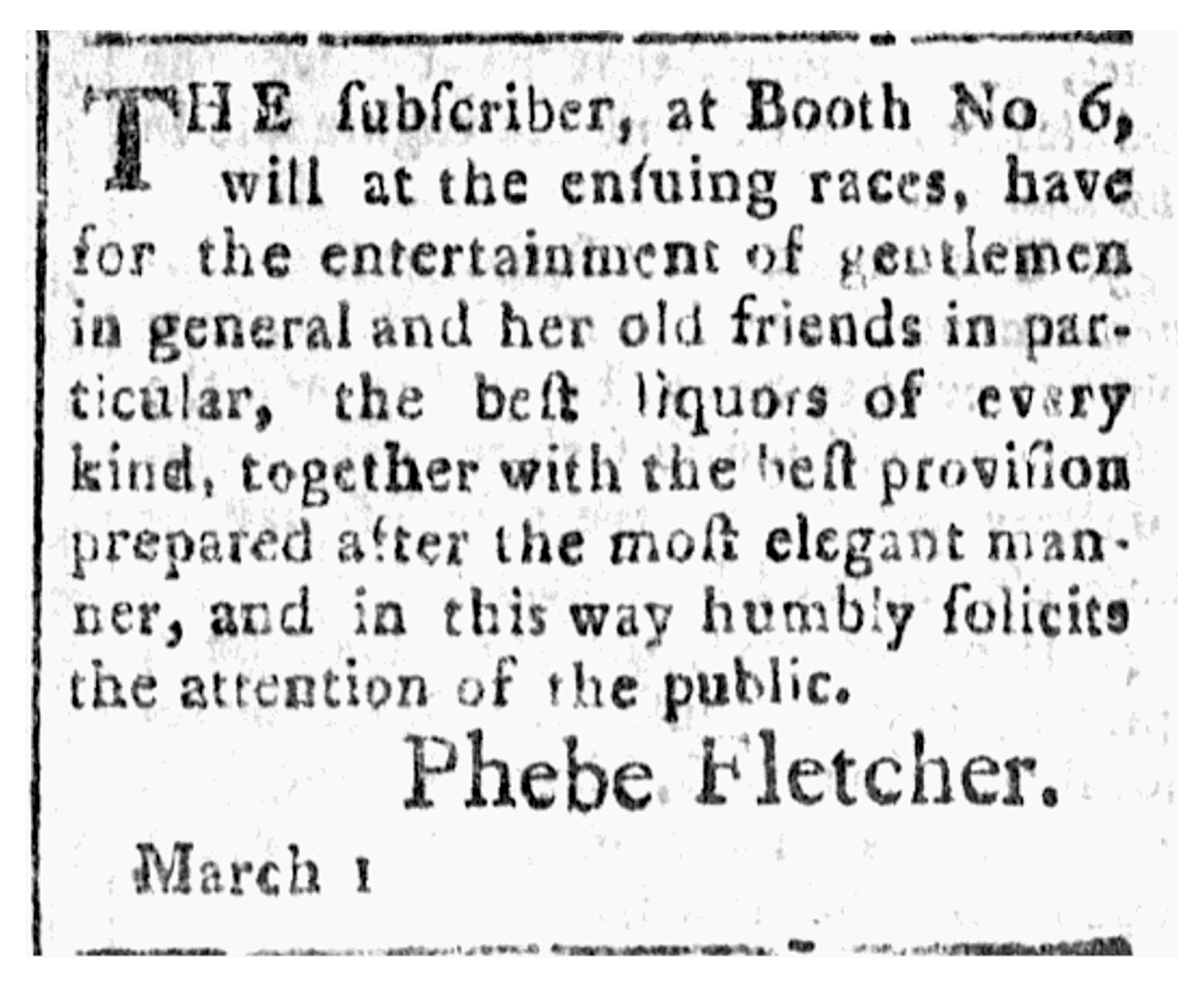 The final piece of evidence relating to Phebe’s life appeared during Charleston’s first post-war horse-racing season in early March 1791. Through the local newspapers, she announced that she had taken charge of “Booth No. 6” at a newly-created venue called Washington Race Course (now Hampton Park), where she offered “for the entertainment of the gentlemen in general and her old friends in particular, the best liquors of every kind, together with the best provisions prepared after the most elegant manner, and in this way humbly solicits the attention of the public.”[16]